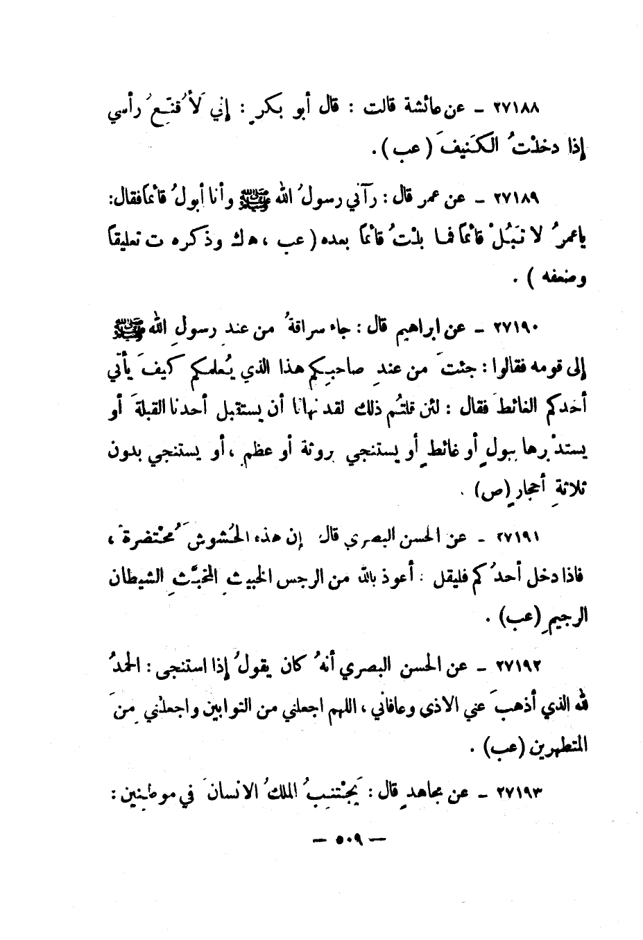 27190- عن إبراهيم قال: "جاء سراقة من عند رسول الله صلى الله عليه وسلم إلى قومه فقالوا: جئت من عند صاحبكم هذا الذي يعلمكم كيف يأتي أحدكم الغائط فقال: لئن قلتم ذلك لقد نهانا أن يستقبل أحدنا القبلة أو يستدبرها ببول أو غائط أو يستنجي بروثة أو عظم، أو يستنجي بدون ثلاثة أحجار". "ص".