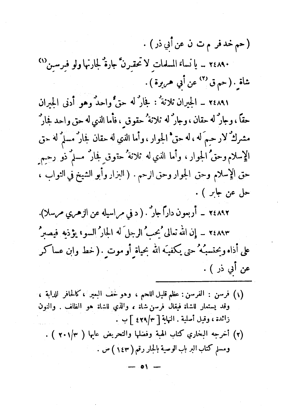 24890- "يا نساء المسلمات لا تحقرن جارة لجارتها ولو فرسن 1 شاة". "حم ق 2 عن أبي هريرة".