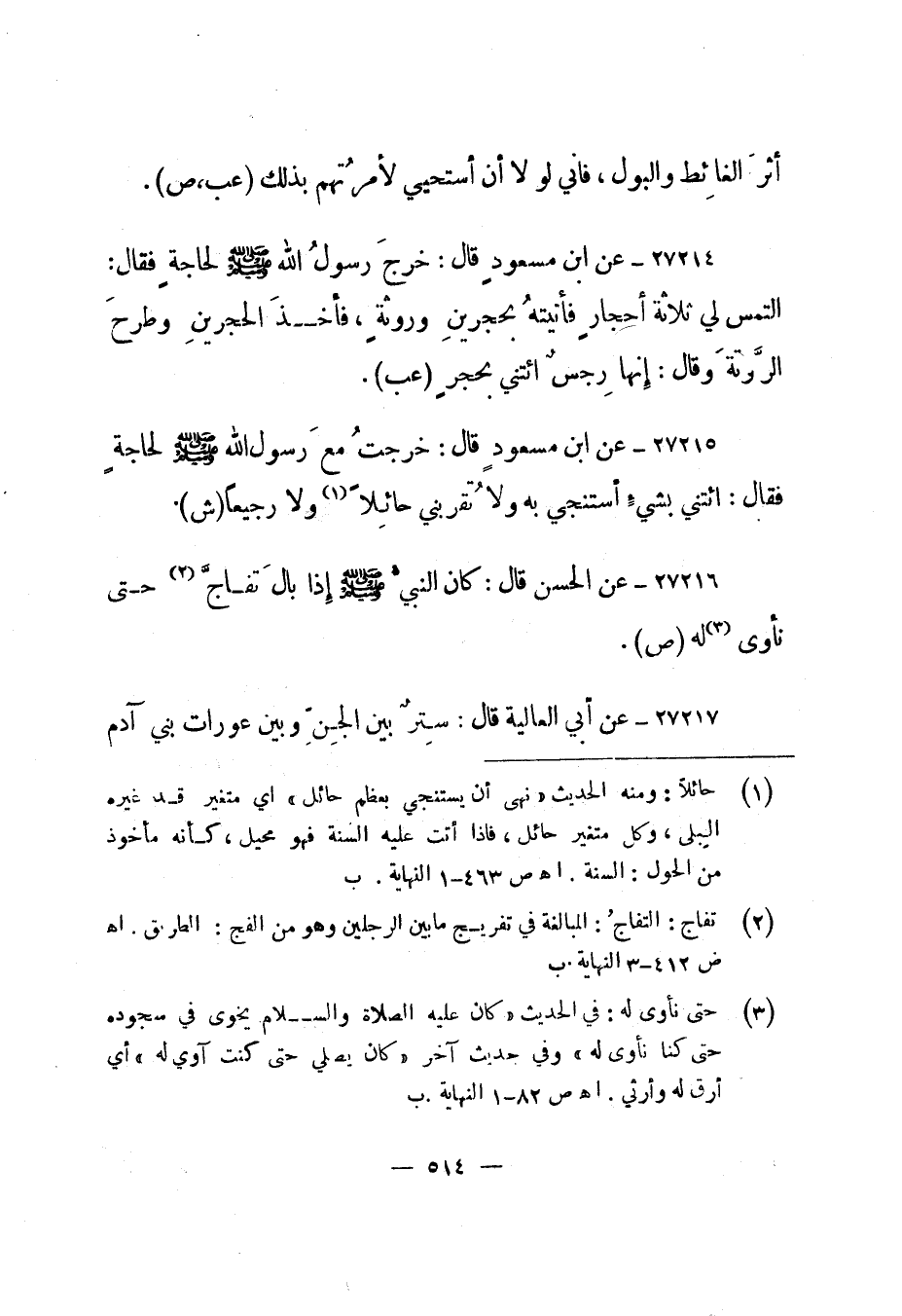 27215- عن ابن مسعود قال: "خرجت مع رسول الله صلى الله عليه وسلم لحاجة فقال: " ائتني بشيء أستنجي به ولا تقربني حائلا 1 ولا رجيعا". "ش".