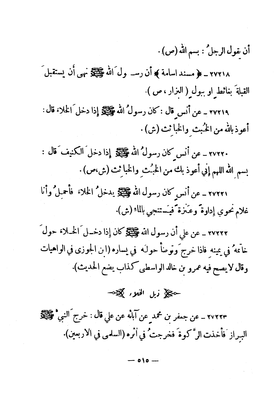 27218- "مسند أسامة" أن رسول الله صلى الله عليه وسلم "نهى أن يستقبل القبلة بغائط أو ببول". "البزار، ص".