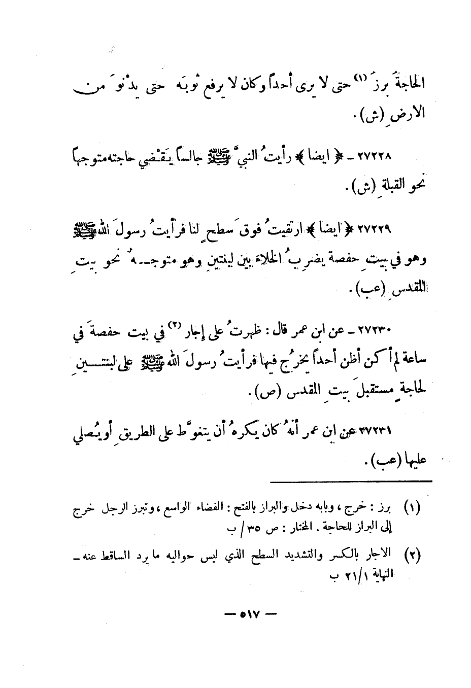 27229- "أيضا" "ارتقيت فوق سطح لنا فرأيت رسول الله صلى الله عليه وسلم وهو في بيت حفصة يضرب الخلاء بين لبنتين وهو متوجه نحو بيت المقدس". "عب".