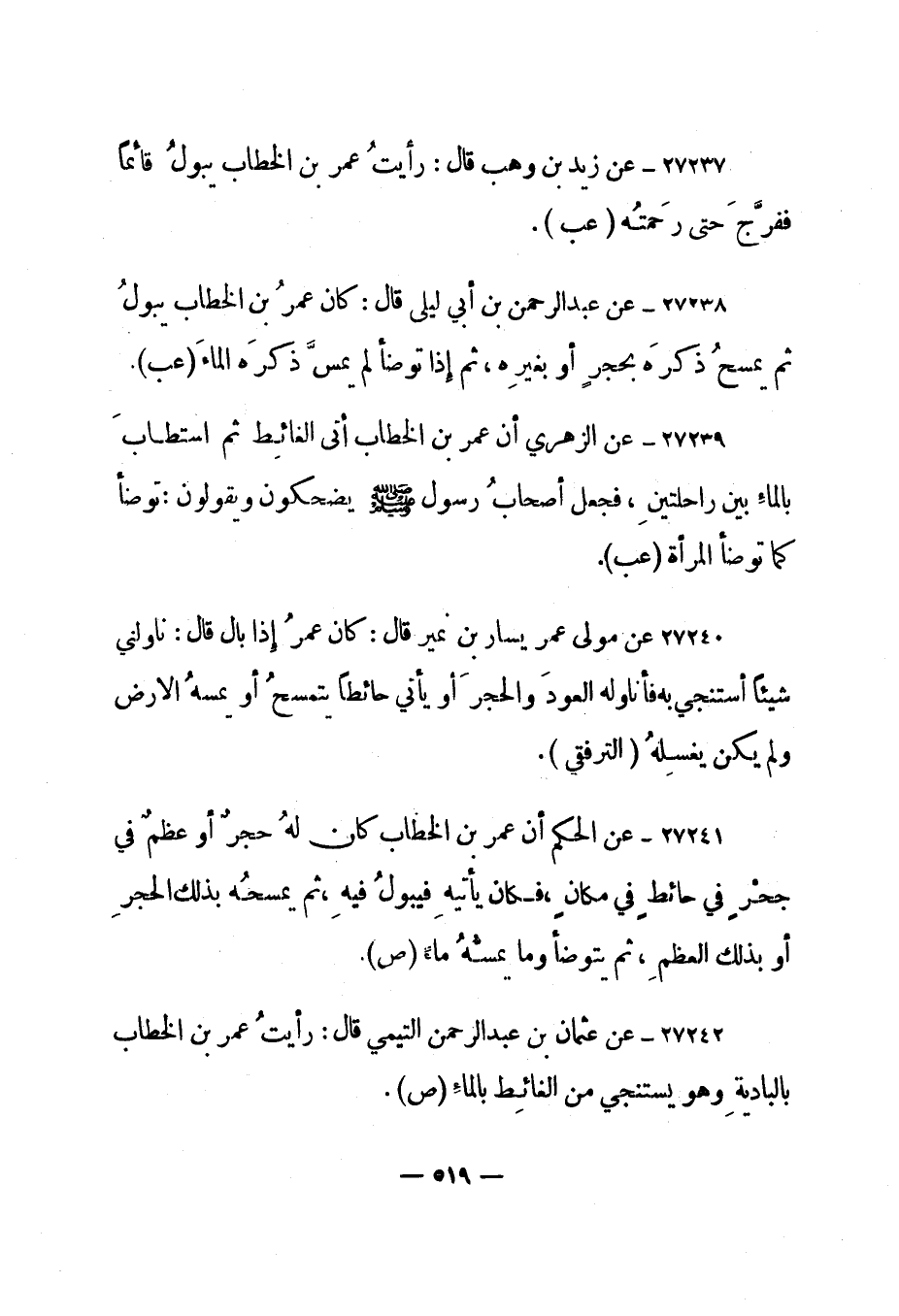 27240- عن مولى عمر يسار بن نمير قال: "كان عمر إذا بال قال: ناولني شيئا أستنجي به فأناوله العود والحجر أو يأتي حائطا يتمسح أو يمسه الأرض ولم يكن يغسله". "الترفقي".