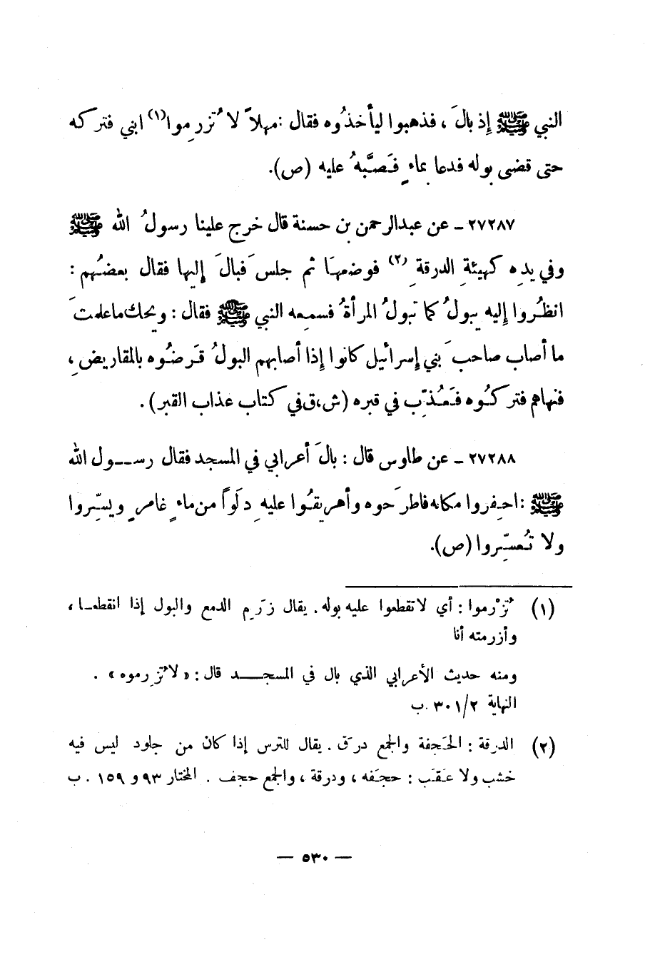 1 تزرموا: أي لا تقطعوا عليه بوله. يقال زرم الدمع والبول إذا انقطعا، وأزرمته أنا
