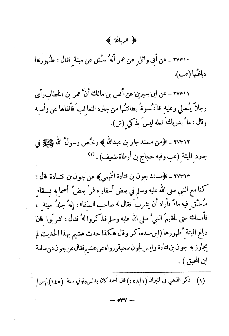 27310- عن أبي وائل عن عمر أنه "سئل عن ميتة فقال: طهورها دباغها". "عب".