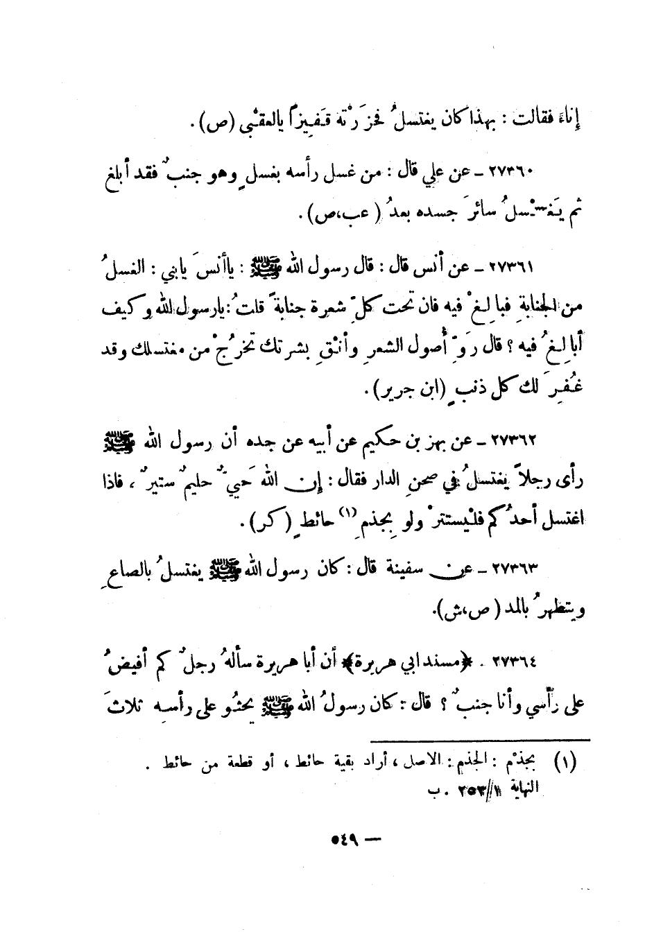 27364- "مسند أبي هريرة" أن أبا هريرة سأله رجل كم أفيض على رأسي وأنا جنب؟ قال: كان رسول الله صلى الله عليه وسلم يحثو على رأسه ثلاث"