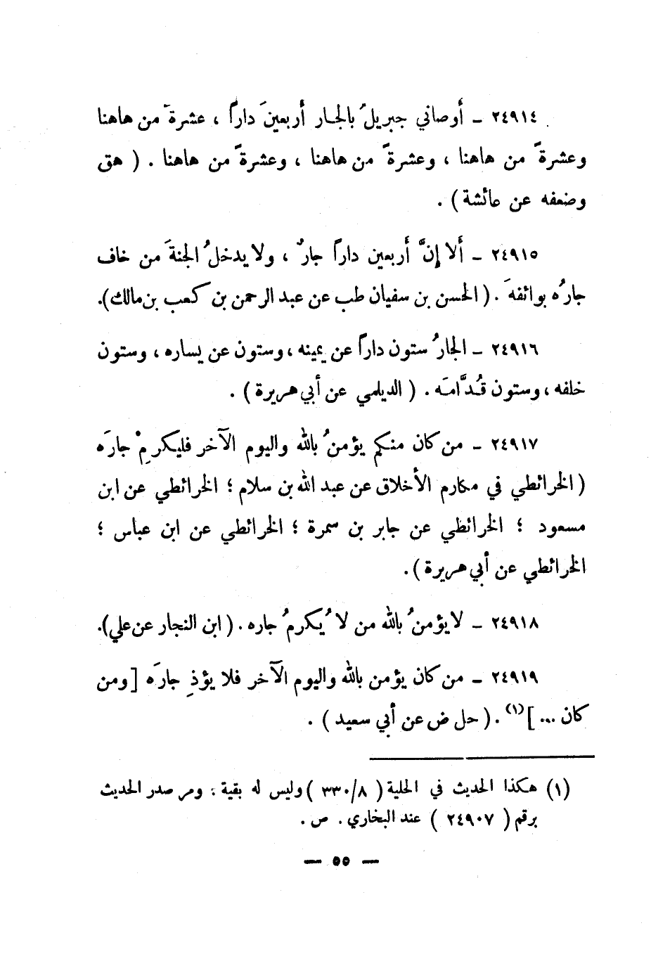 24914- "أوصاني جبريل بالجار أربعين دارا، عشرة من ها هنا وعشرة من ها هنا، وعشرة من ها هنا، وعشرة من ها هنا". "هق وضعفه عن عائشة".