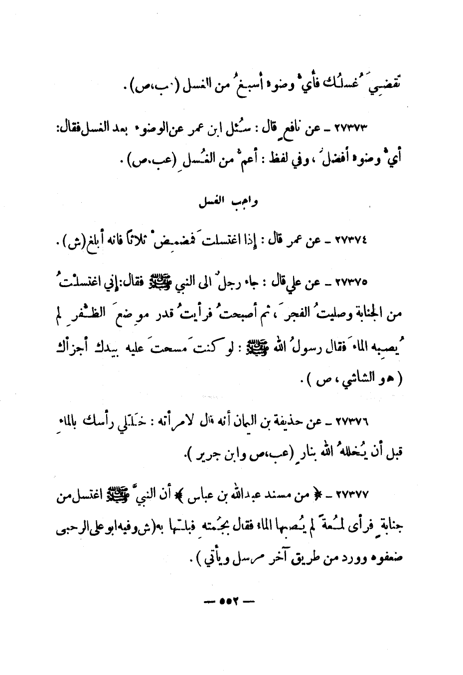 27377- "من مسند عبد الله بن عباس" "أن النبي صلى الله عليه وسلم اغتسل من جنابة فرأى لمعة لم يصبها الماء فقال بجمته فبلها به". "ش وفيه أبو علي الرحبى ضعفوه وورد من طريق آخر مرسل ويأتي".