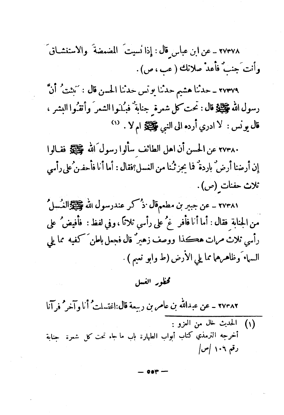 27379- حدثنا هشيم حدثنا يونس حدثنا الحسن قال: "نبئت أن رسول الله صلى الله عليه وسلم قال: "تحت كل شعرة جنابة فبلوا الشعر وأنقوا البشر"، قال يونس: لا أدري أرده إلى النبي صلى الله عليه وسلم أم لا. 1