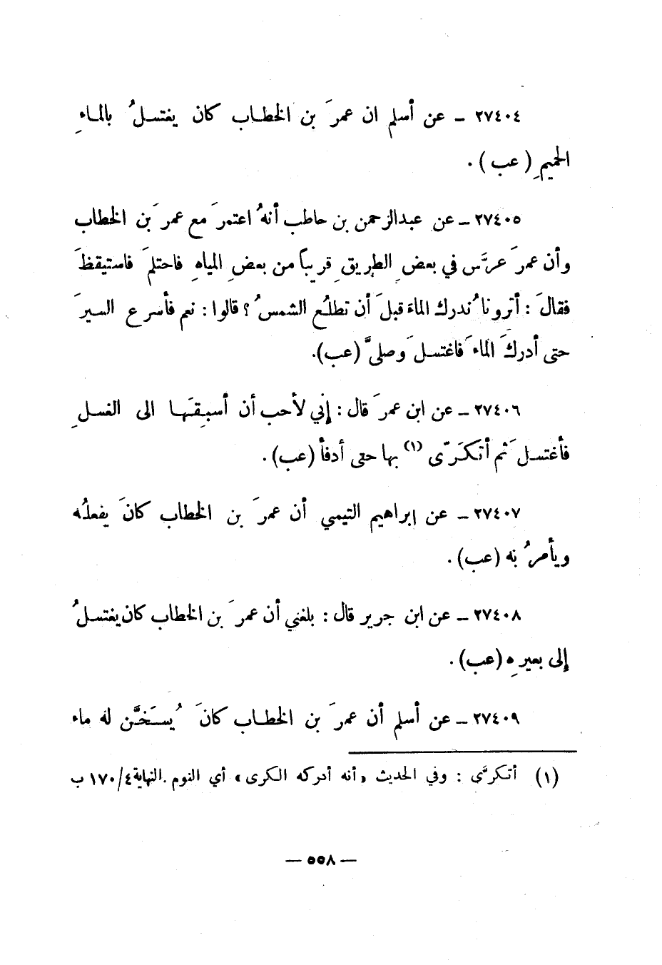 27408- عن ابن جرير قال: "بلغني أن عمر بن الخطاب كان يغتسل إلى بعيره". "عب".