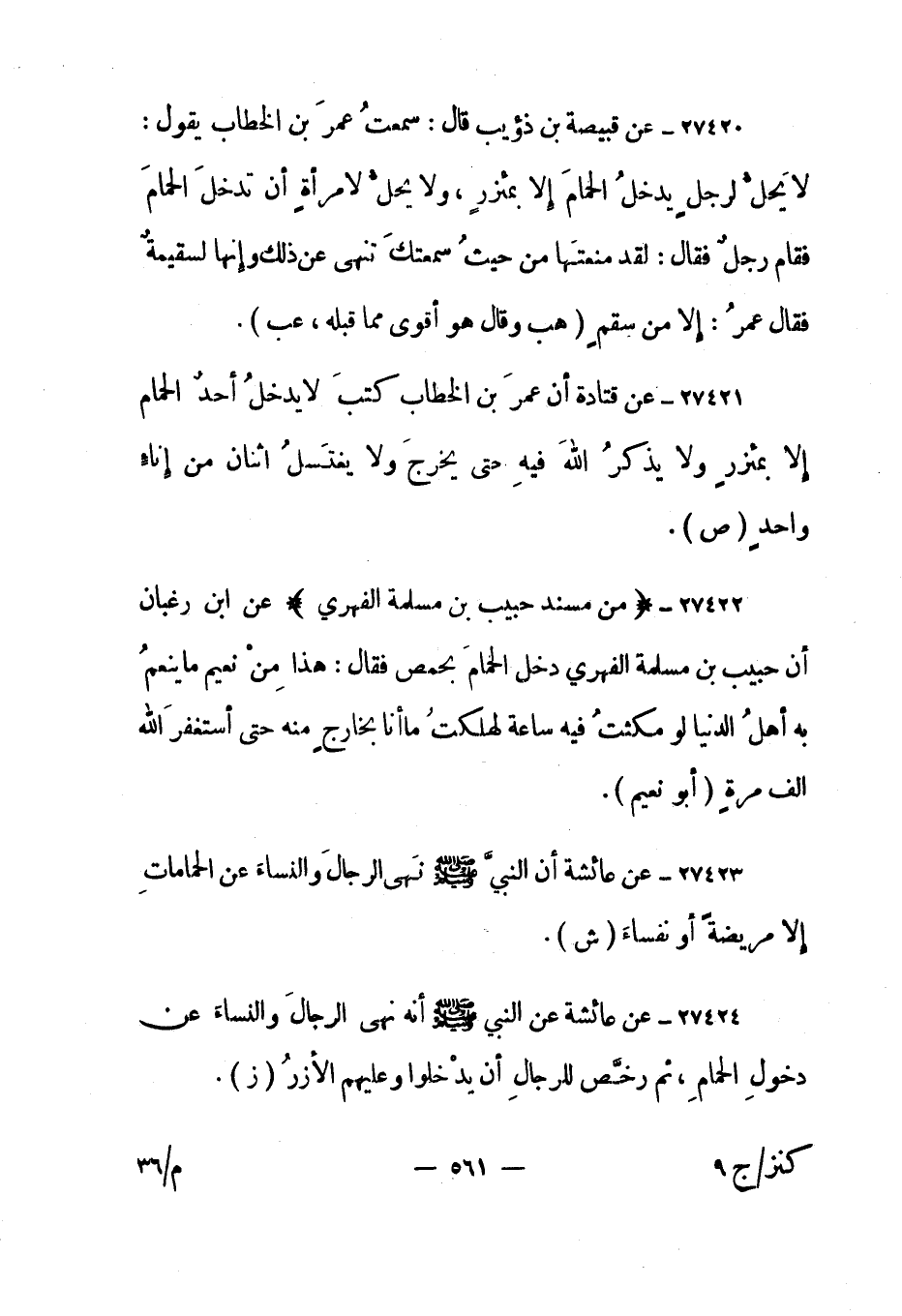 27420- عن قبيصة بن ذؤيب قال: "سمعت عمر بن الخطاب يقول: لا يحل لرجل يدخل الحمام إلا بمئزر، ولا يحل لامرأة أن تدخل الحمام فقام رجل فقال: لقد منعتها من حيث سمعتك تنهى عن ذلك وإنها لسقيمة فقال عمر: إلا من سقم". "هب وقال هو أقوى مما قبله، عب".