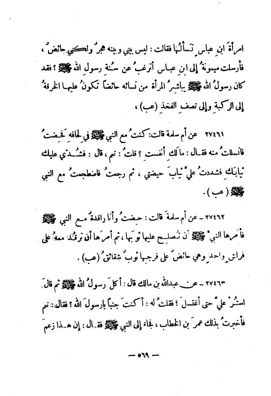 27462- عن أم سلمة قالت: "حضت وأنا راقدة مع النبي صلى الله عليه وسلم فأمرها النبي صلى الله عليه وسلم أن تصلح عليها ثوبها، ثم أمرها أن ترقد معه على فراش واحد وهي حائض على فرجها ثوب شقائق". "عب".
