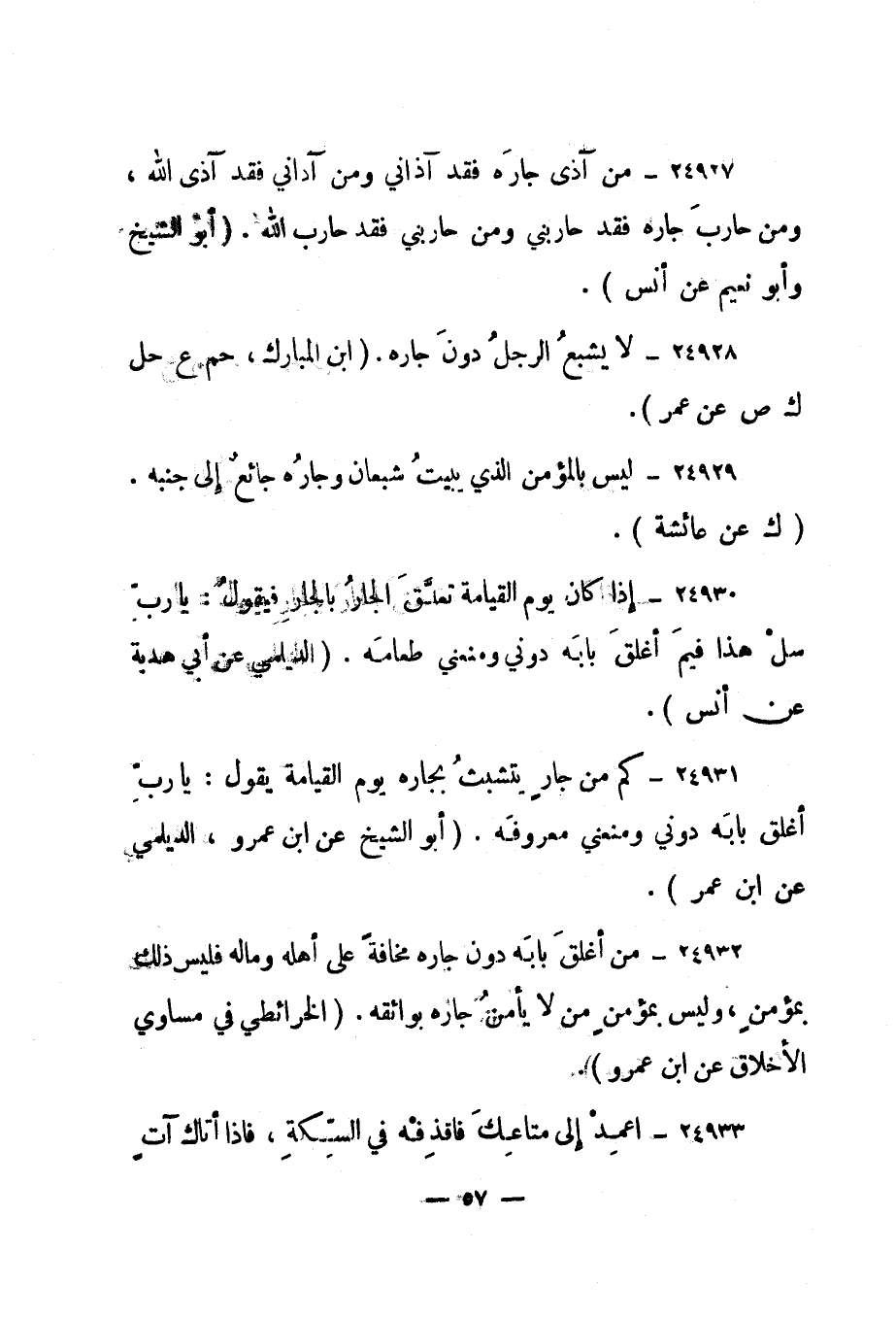 24931- "كم من جار يتشبث بجاره يوم القيامة يقول: يا رب أغلق بابه دوني ومنعني معروفه". "أبو الشيخ عن ابن عمرو، الديلمي عن ابن عمر".