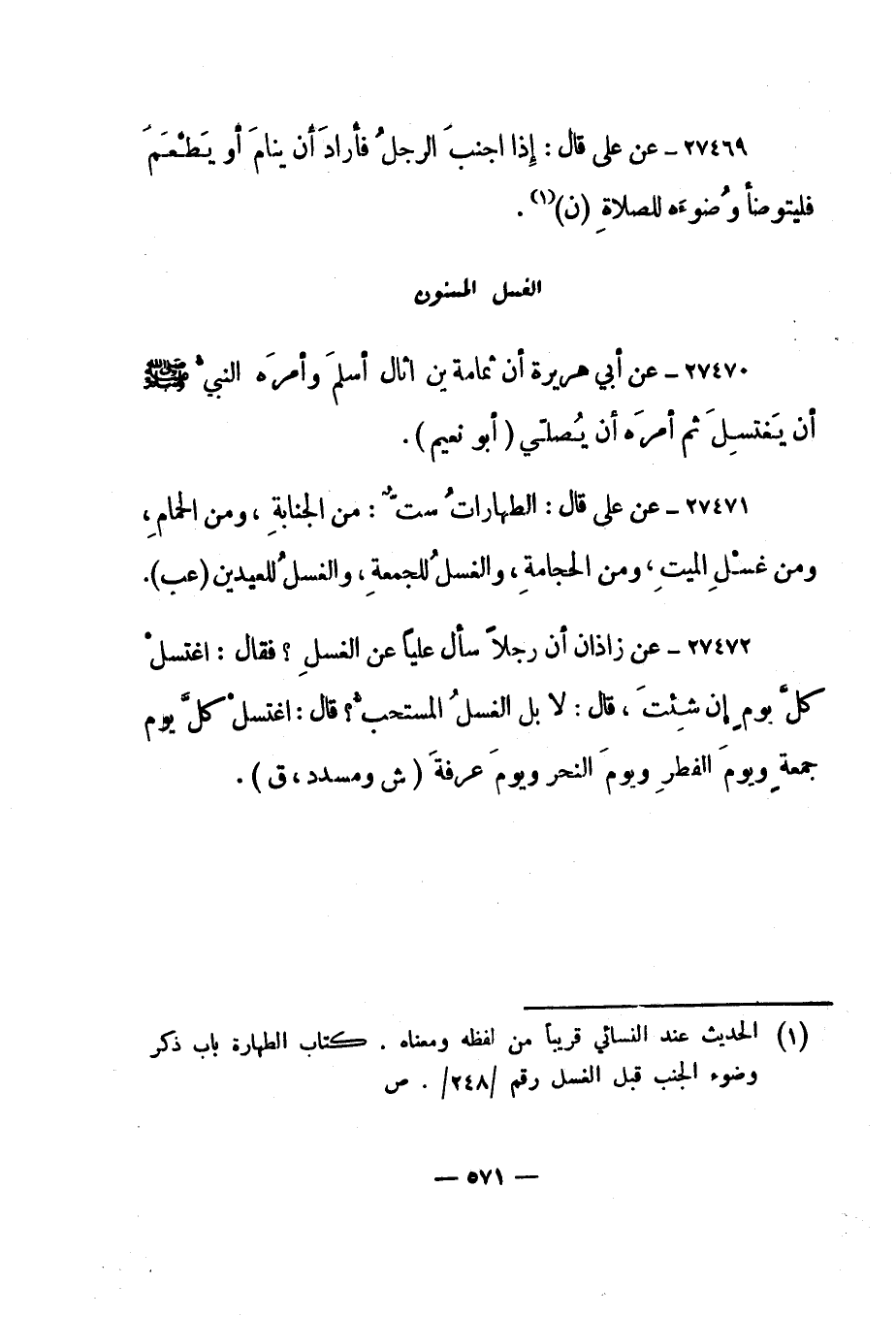 27472- عن زاذان "أن رجلا سأل عليا عن الغسل؟ فقال: اغتسل كل يوم إن شئت، قال: لا بل الغسل المستحب؟ قال: اغتسل كل يوم جمعة ويوم الفطر ويوم النحر ويوم عرفة". "ش ومسدد، ق".
