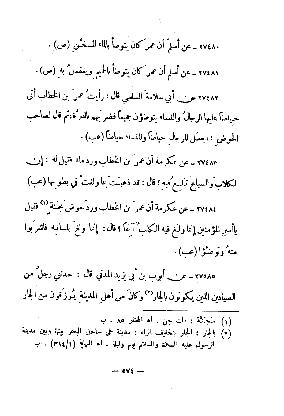 27481- عن أسلم "أن عمر كان يتوضأ بالحميم ويغتسل به". "ص".