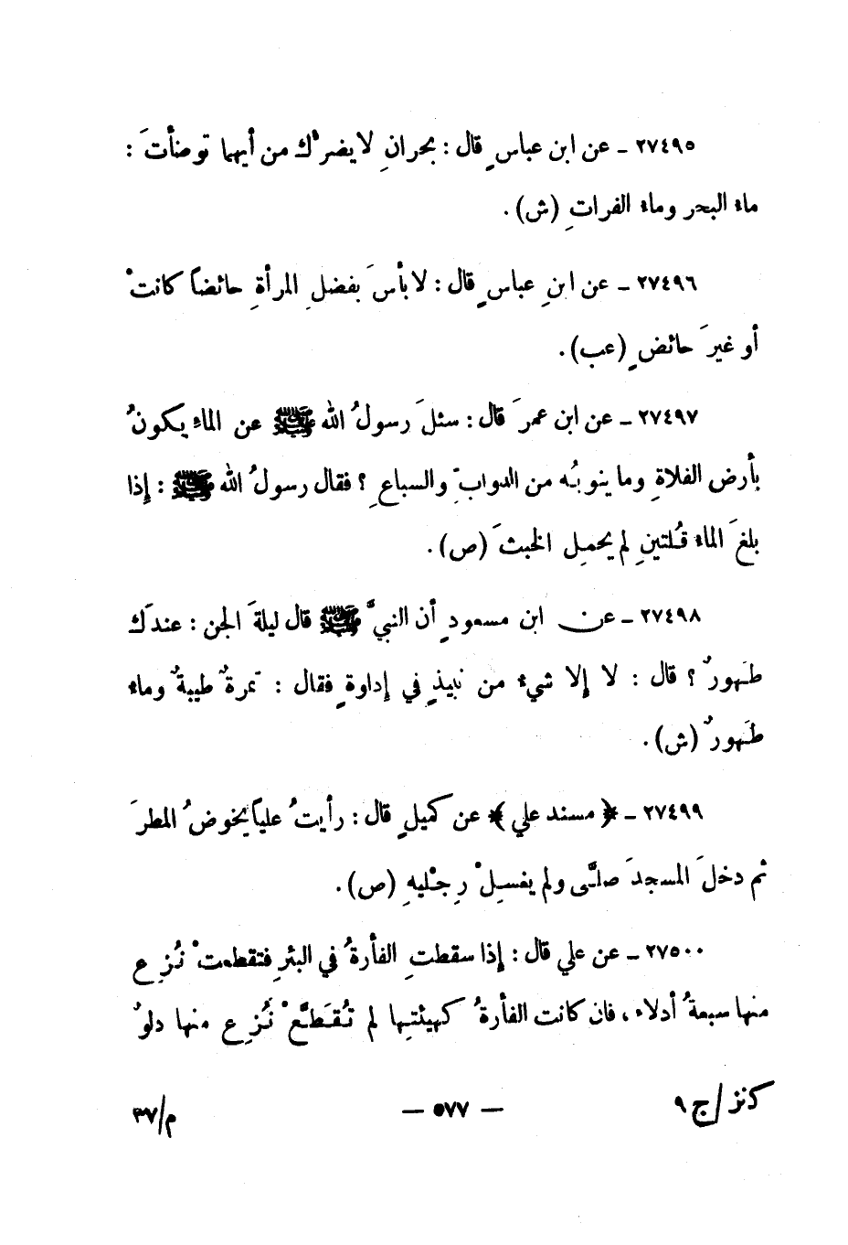 27497- عن ابن عمر قال: "سئل رسول الله صلى الله عليه وسلم عن الماء يكون بأرض الفلاة وما ينوبه من الدواب والسباع؟ فقال رسول الله صلى الله عليه وسلم: "إذا بلغ الماء قلتين لم يحمل الخبث". "ص".