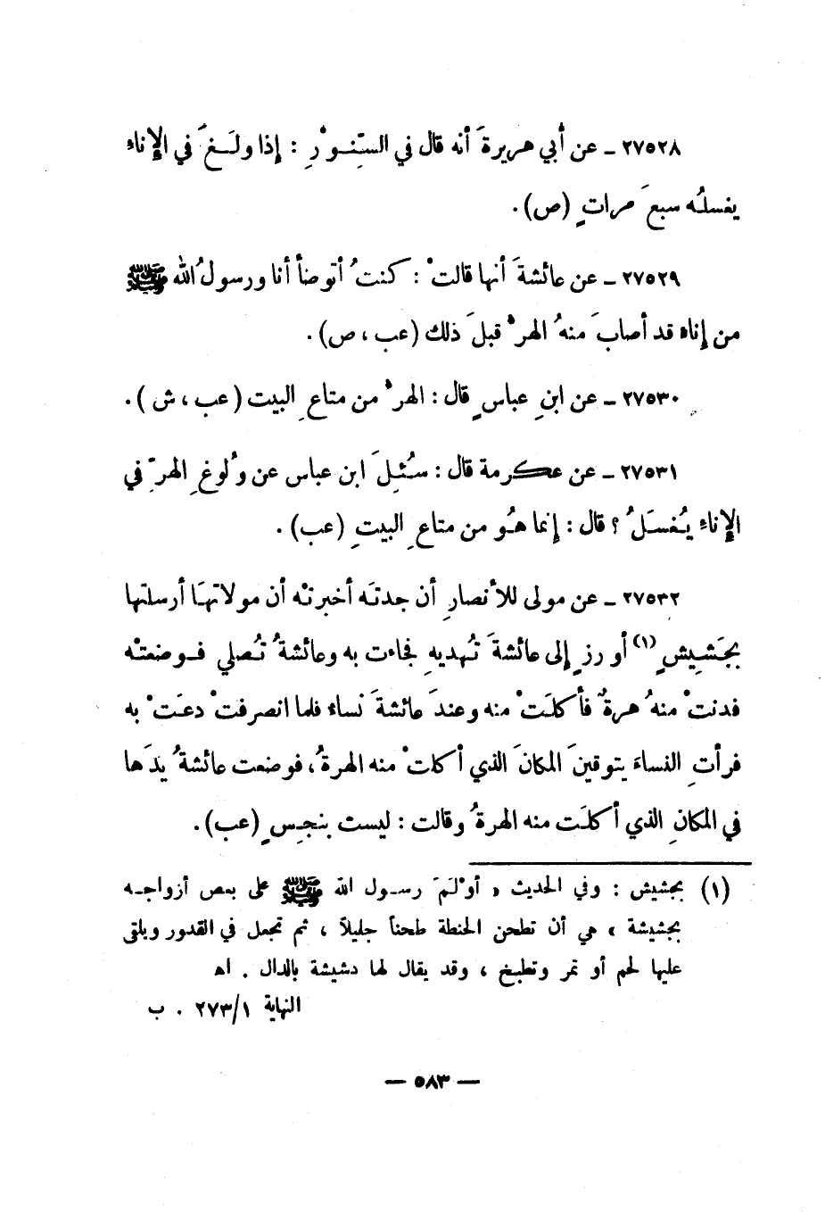 27532- عن مولى للأنصار" أن جدته أخبرته أن مولاتها أرسلتها بجشيش 1 أو رز إلى عائشة تهديه فجاءت به وعائشة تصلي فوضعته فدنت منه هرة فأكلت منه وعند عائشة نساء فلما انصرفت دعت به فرأت النساء يتوقين المكان الذي أكلت منه الهرة، فوضعت عائشة يدها في المكان الذي أكلت منه الهرة وقالت: ليست بنجس". "عب".
