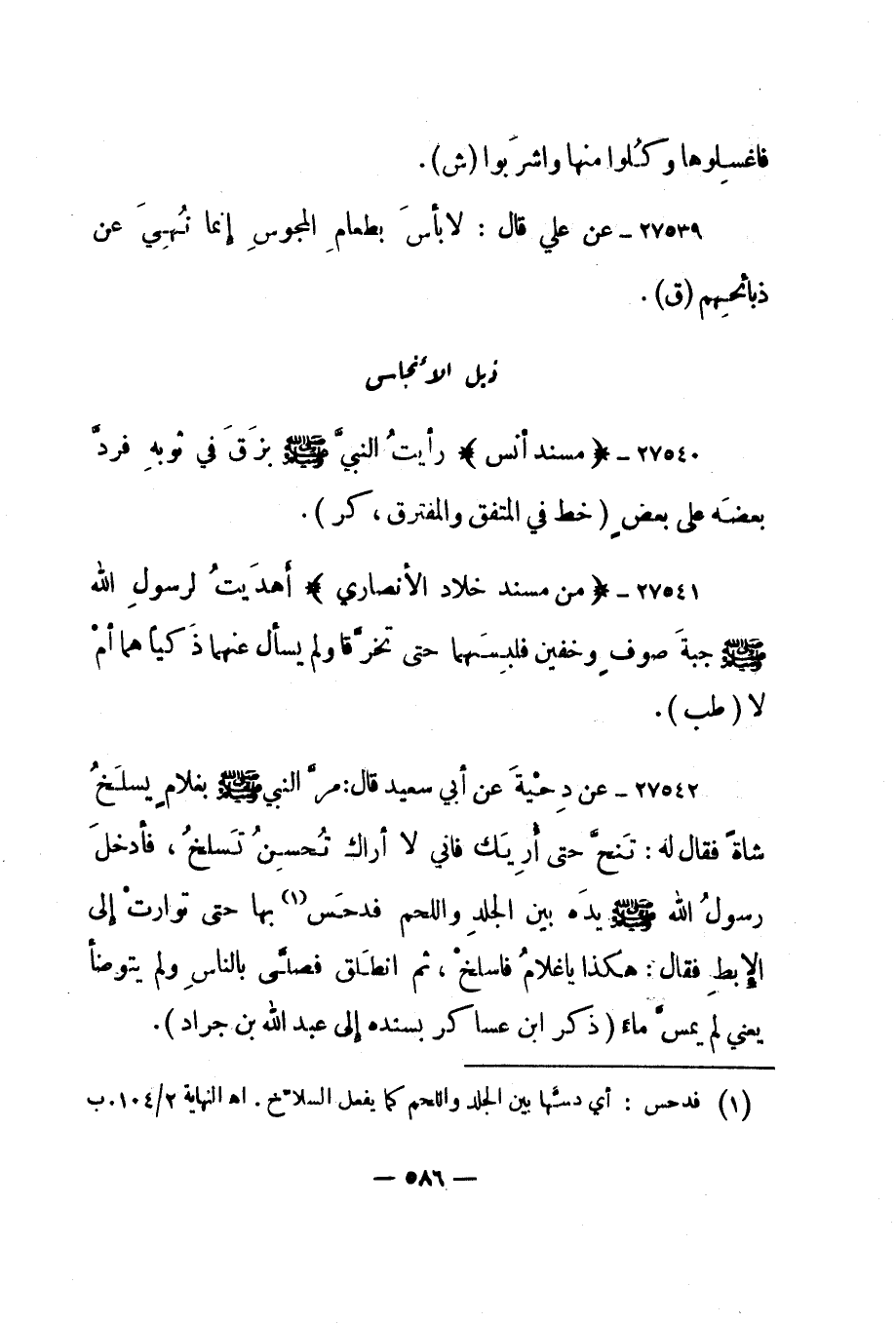 27542- عن دحية عن أبي سعيد قال: "مر النبي صلى الله عليه وسلم بغلام يسلخ شاة فقال له: "تنح حتى أريك فإني لا أراك تحسن تسلخ"، فأدخل رسول الله صلى الله عليه وسلم يده بين الجلد واللحم فدحس 1 بها حتى توارت إلى الإبط فقال: "هكذا يا غلام فاسلخ"، ثم انطلق فصلى بالناس ولم يتوضأ" يعني لم يمس ماء."ذكر ابن عساكر بسنده إلى عبد الله بن جراد".
