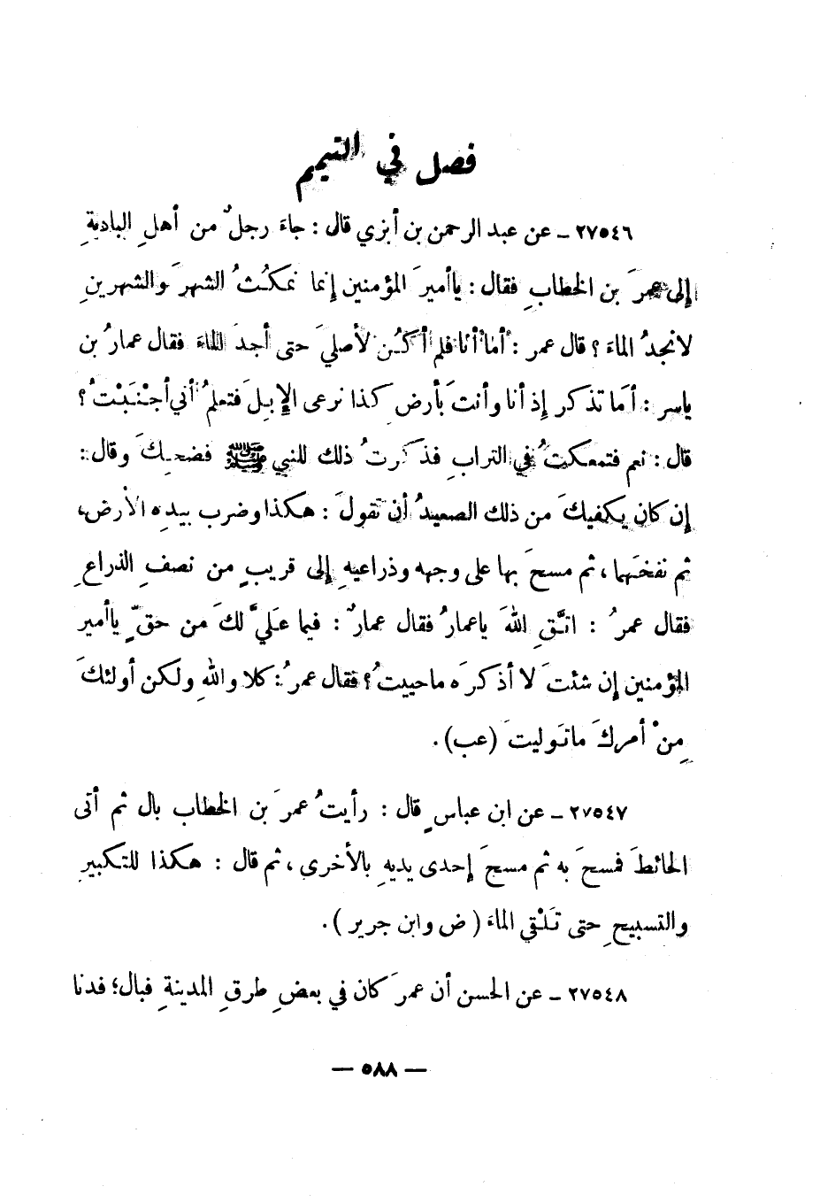 27547- عن ابن عباس قال: "رأيت عمر بن الخطاب بال ثم أتى الحائط فمسح به ثم مسح إحدى يديه بالأخرى، ثم قال: هكذا للتكبير والتسبيح حتى تلقى الماء". "ض وابن جرير".