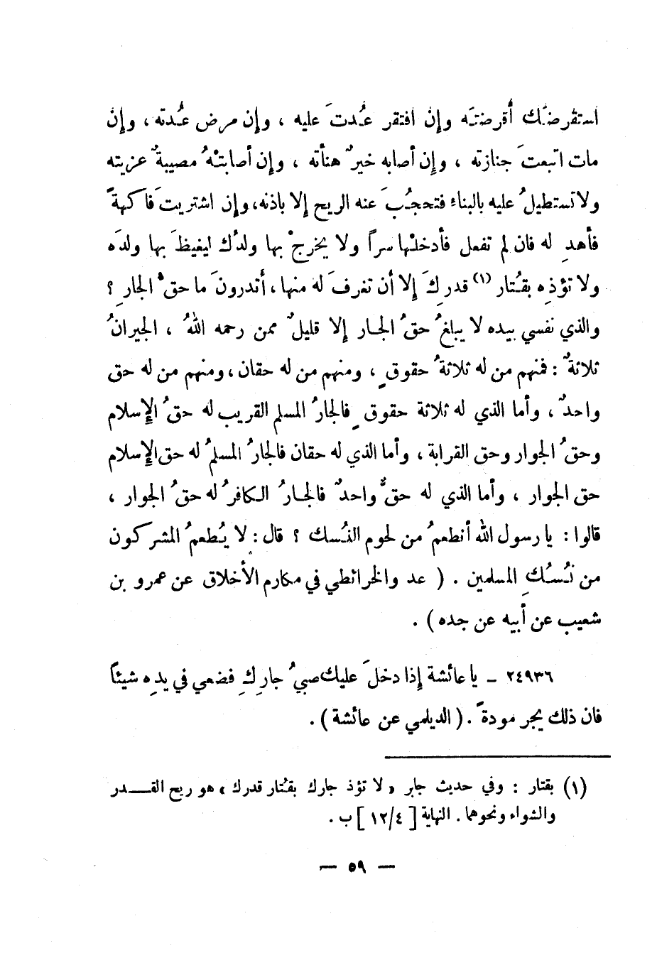 استقرضك أقرضته وإن افتقر عدت عليه، وإن مرض عدته، وإن مات اتبعت جنازته، وإن أصابه خير هنأته، وإن أصابته مصيبة عزيته ولا تستطيل عليه بالبناء فتحجب عنه الريح إلا بإذنه، وإن اشتريت فاكهة فأهد له فإن لم تفعل فأدخلها سرا ولا يخرج بها ولدك ليغيظ بها ولده ولا تؤذه بقتار 1 قدرك إلا أن تغرف له منها، أتدرون ما حق الجار؟ والذي نفسي بيده لا يبلغ حق الجار إلا قليل ممن رحمه الله، الجيران ثلاثة: فمنهم من له ثلاثة حقوق، ومنهم من له حقان، ومنهم من له حق واحد، وأما الذي له ثلاثة حقوق فالجار المسلم القريب له حق الإسلام وحق الجوار وحق القرابة، وأما الذي له حقان فالجار المسلم له حق الإسلام حق الجوار، وأما الذي له حق واحد فالجار الكافر له حق الجوار، قالوا: يا رسول الله أنطعم من لحوم النسك؟ قال: لا يطعم المشركون من نسك المسلمين". "عد والخرائطي في مكارم الأخلاق عن عمرو بن شعيب عن أبيه عن جده".