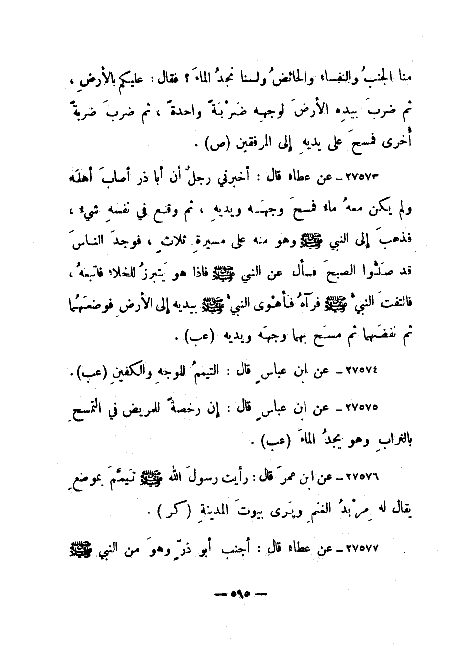 27573- عن عطاء قال: "أخبرني رجل أن أبا ذر أصاب أهله ولم يكن معه ماء فمسح وجهه ويديه، ثم وقع في نفسه شيء، فذهب إلى النبي صلى الله عليه وسلم وهو منه على مسيرة ثلاث، فوجد الناس قد صلوا الصبح فسأل عن النبي صلى الله عليه وسلم فإذا هو يتبرز للخلاء فاتبعه، فالتفت النبي صلى الله عليه وسلم فرآه فأهوى النبي صلى الله عليه وسلم بيديه إلى الأرض فوضعهما ثم نفضهما ثم مسح بهما وجهه ويديه". "عب".