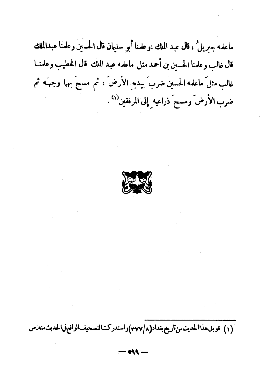 ما علمه جبريل، قال عبد الملك: وعلمنا أبو سليمان قال الحسين وعلمنا عبد الملك قال غالب وعلمنا الحسين بن أحمد مثل ما علمه عبد الملك قال الخطيب وعلمنا غالب مثل ما علمه الحسين ضرب بيديه الأرض، ثم مسح بهما وجهه ثم ضرب الأرض ومسح ذراعيه إلى المرفقين 1