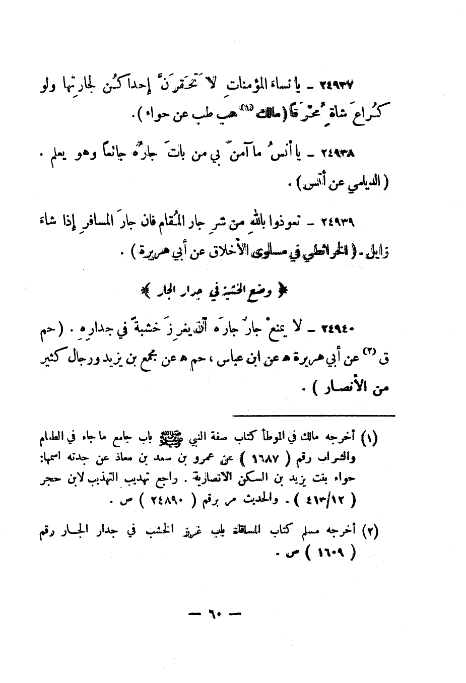 24940- "لا يمنع جار جاره أن يغرز خشبة في جداره". "حم ق 1 عن أبي هريرة هـ عن ابن عباس، حم هـ عن مجمع بن يزيد ورجال كثير من الأنصار".
