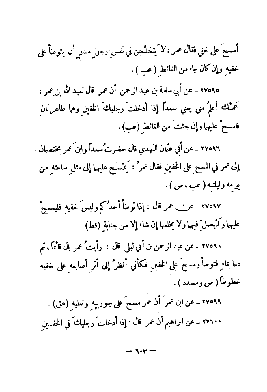 27598- عن عبد الرحمن بن أبي ليلى قال: "رأيت عمر بال قائما، ثم دعا بماء فتوضأ ومسح على الخفين فكأني أنظر إلى أثر أصابعه على خفيه خطوطا". "ص ومسدد".