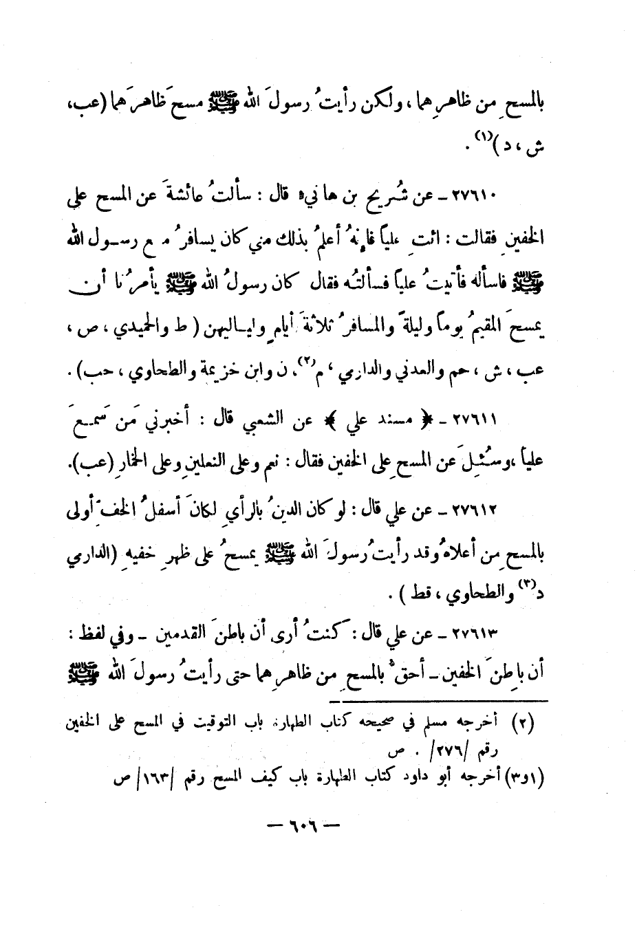 27612- عن علي قال: "لو كان الدين بالرأي لكان أسفل الخف أولى بالمسح من أعلاه وقد رأيت رسول الله صلى الله عليه وسلم يمسح على ظهر خفيه". "الدارمي د 3 والطحاوي، قط".