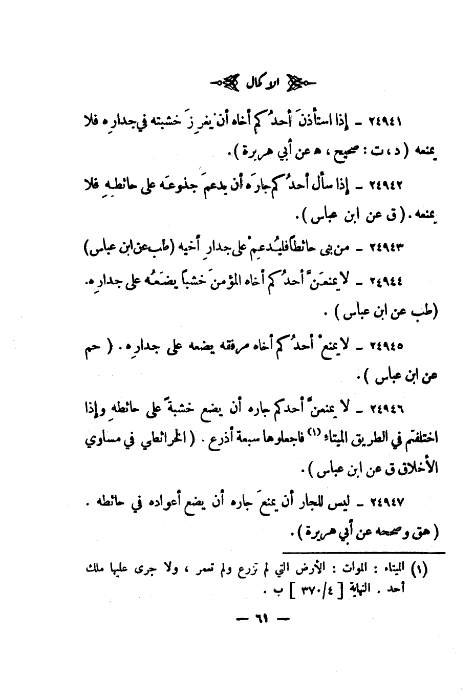 24946- "لا يمنعن أحدكم جاره أن يضع خشبة على حائطه وإذا اختلفتم في الطريق الميتاء 1 فاجعلوها سبعة أذرع". "الخرائطي في مساوي الأخلاق ق عن ابن عباس".