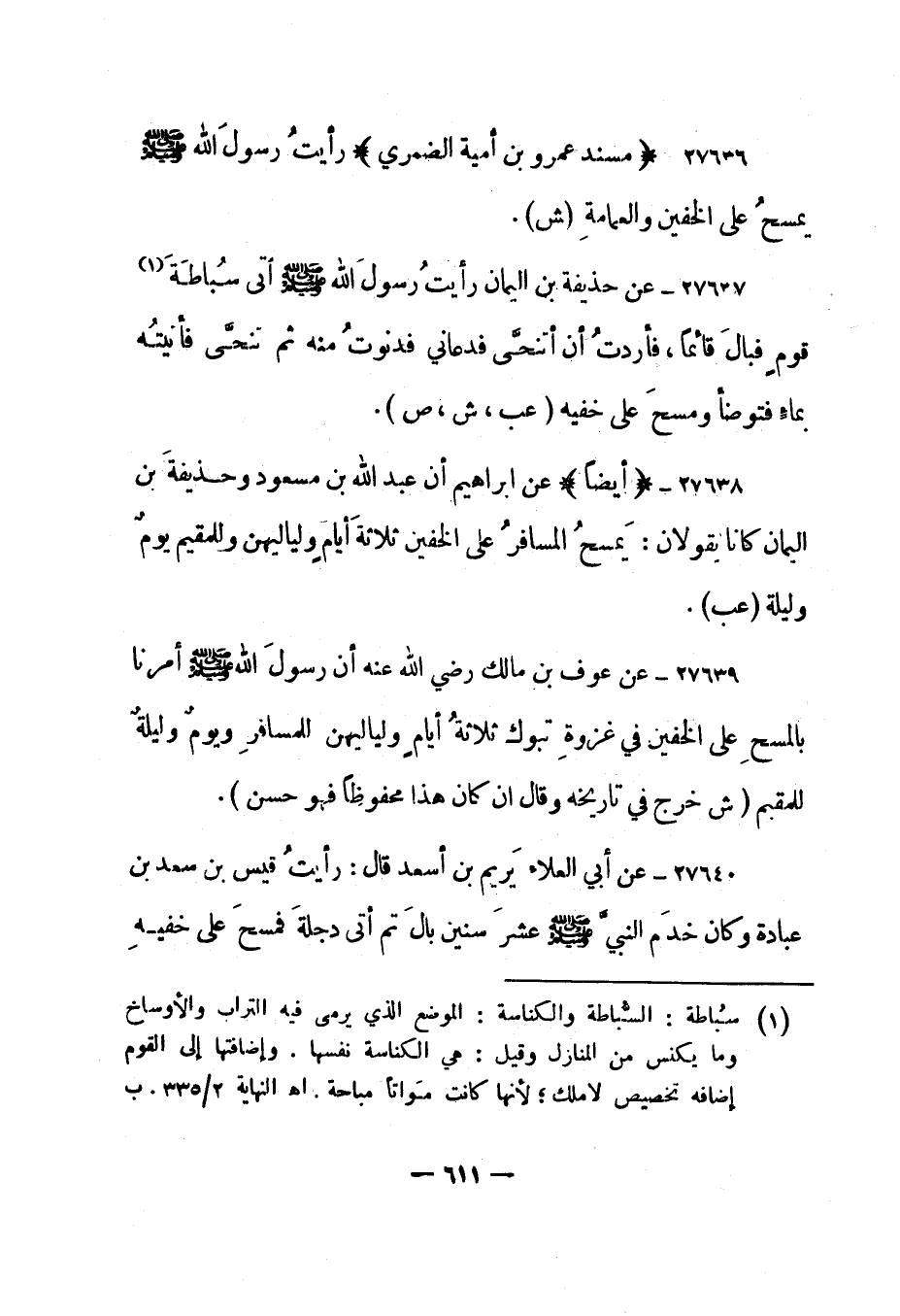 27638- "أيضا" عن إبراهيم أن عبد الله بن مسعود وحذيفة بن اليمان كانا يقولان: "يمسح المسافر على الخفين ثلاثة أيام ولياليهن وللمقيم يوم وليلة". "عب".