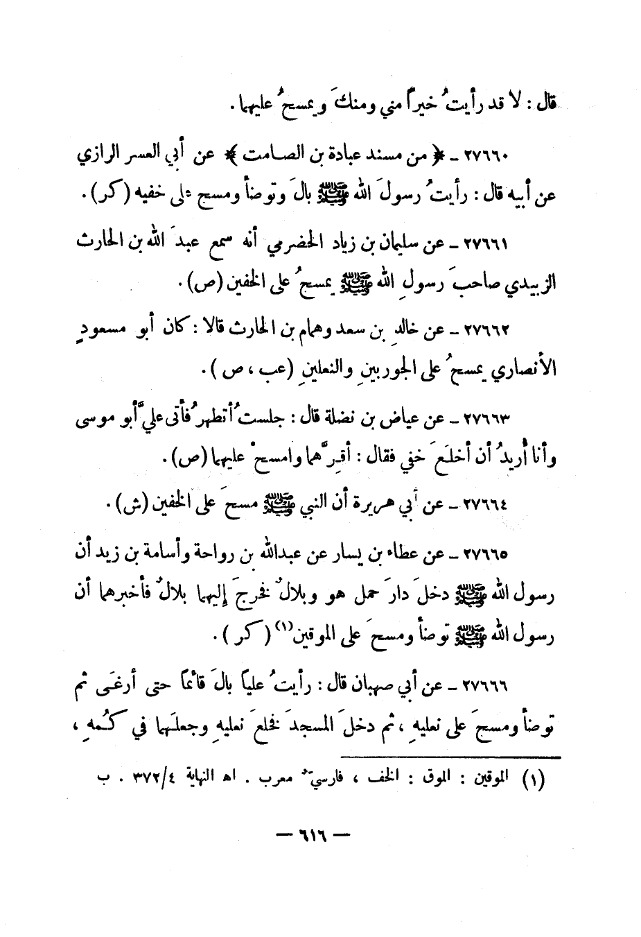 27666- عن أبي صهبان قال: "رأيت عليا بال قائما حتى أرغى ثم توضأ ومسح على نعليه، ثم دخل المسجد فخلع نعليه وجعلهما في كمه،