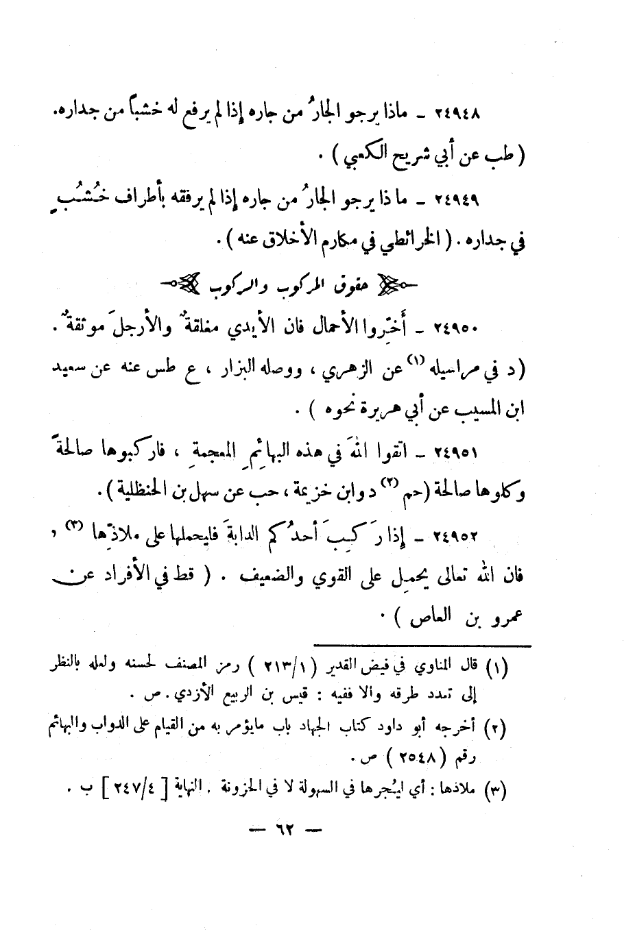 24951- "اتقوا الله في هذه البهائم المعجمة، فاركبوها صالحة وكلوها صالحة". "حم 2 د وابن خزيمة، حب عن سهل بن الحنظلية".