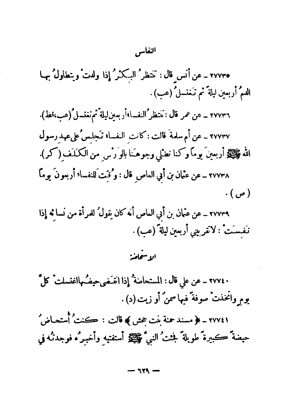27741- "مسند حمنة بنت جحش" قالت: "كنت أستحاض حيضة كبيرة طويلة فجئت النبي صلى الله عليه وسلم أستفتيه وأخبره فوجدته في