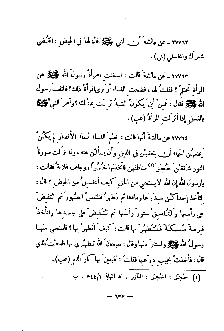 27764- عن عائشة أنها قالت: "نعم النساء نساء الأنصار لم يكن يمنعهن الحياء أن يتفقهن في الدين وأن يسألن عنه، ولما نزلت سورة النور شققن حجز 1 مناطقهن فاتخذنها خمرا، وجاءت فلانة فقالت: يا رسول الله إن الله لا يستحيي من الحق كيف أغتسل من الحيض؟ قال: "لتأخذ إحداكن سدرها وماءها ثم تطهر فتلتمس الطهور ثم لتفض على رأسها ولتلصق ستور رأسها ثم لتفض على جسدها ولتأخذ فرصة ممسكة فلتطهر بها قالت: كيف أتطهر بها؟ فاستحيي منها رسول الله صلى الله عليه وسلم واستتر منها وقال: سبحان الله تطهري بها فلمحت الذي قال، فأخذت بجيب درعها فقلت: تتبعين بها آثار الدم". "عب".