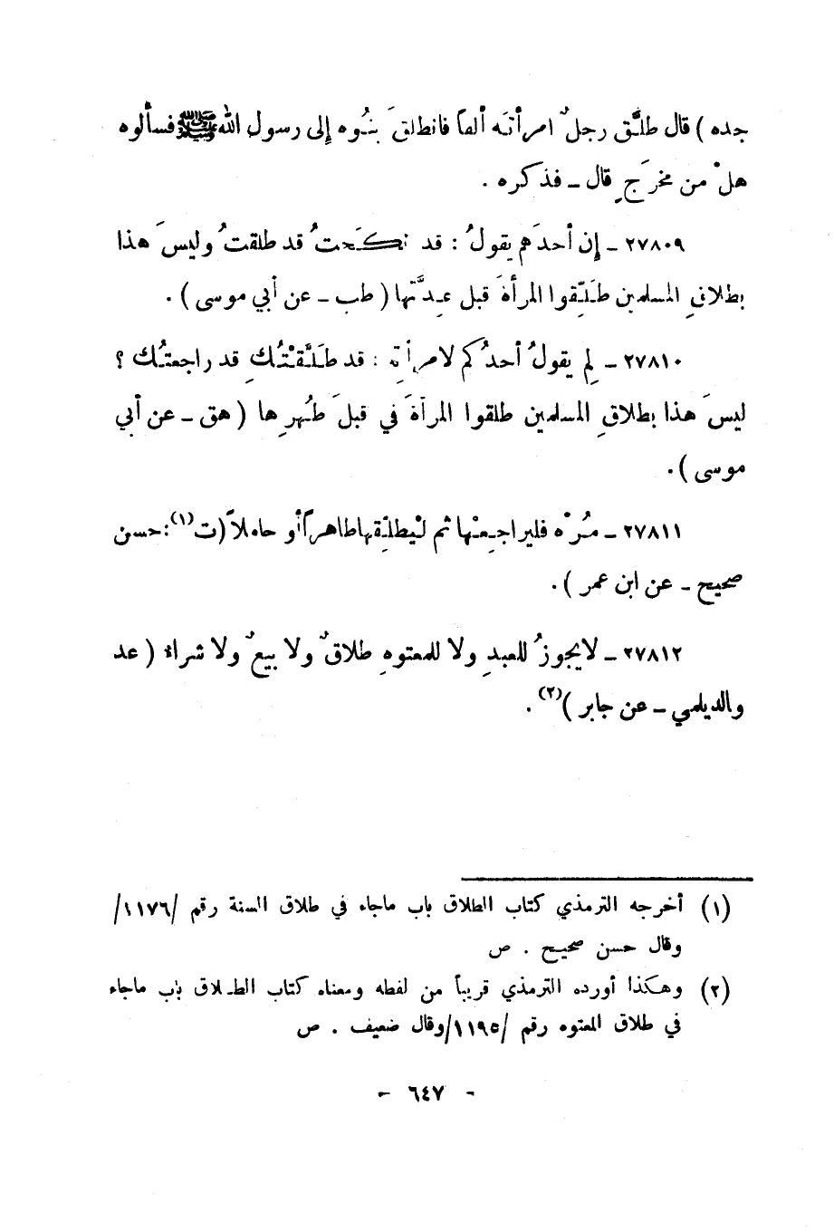 27812- "لا يجوز للعبد ولا للمعتوه طلاق ولا بيع ولا شراء". "عد والديلمي - عن جابر" 2.