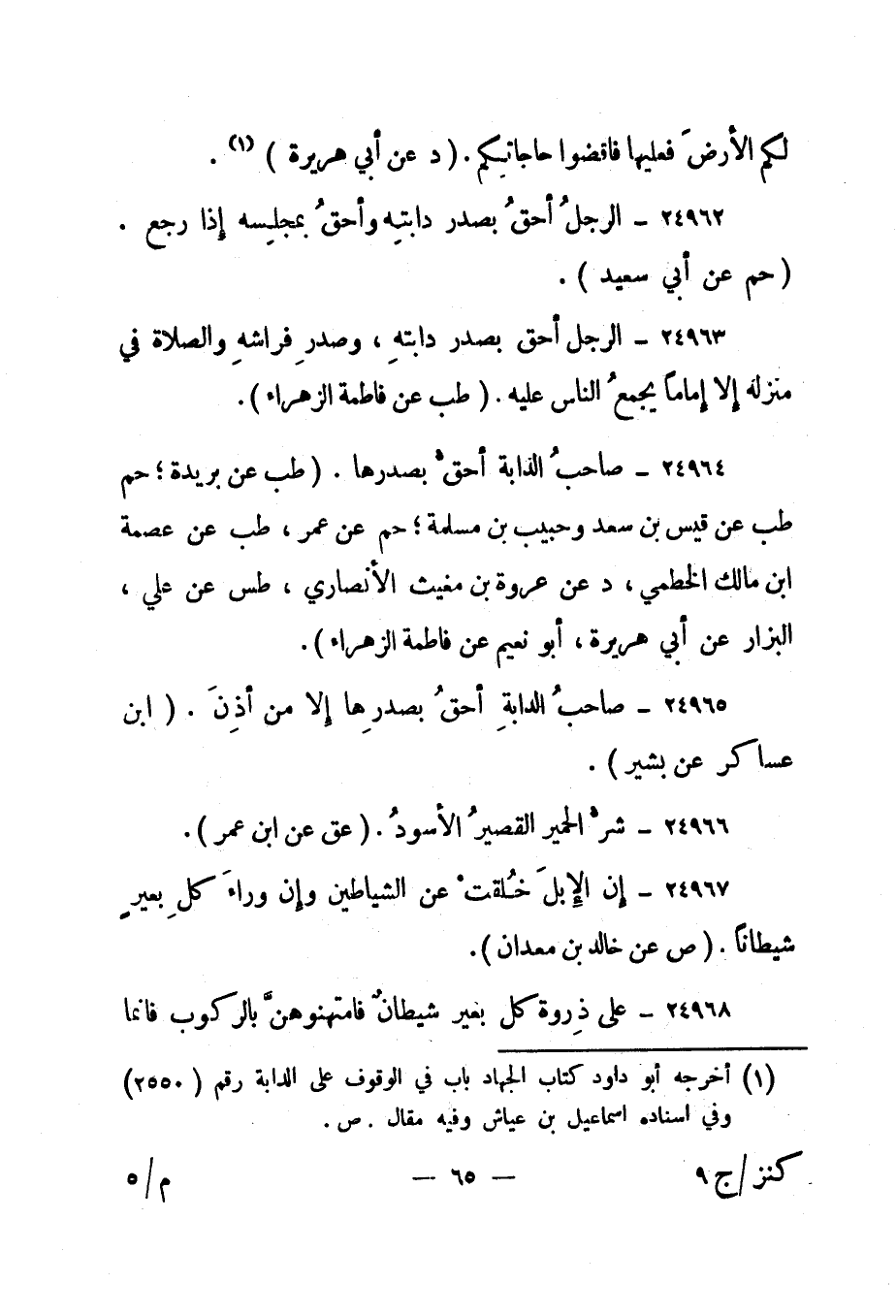 24965- "صاحب الدابة أحق بصدرها إلا من أذن". "ابن عساكر عن بشير".