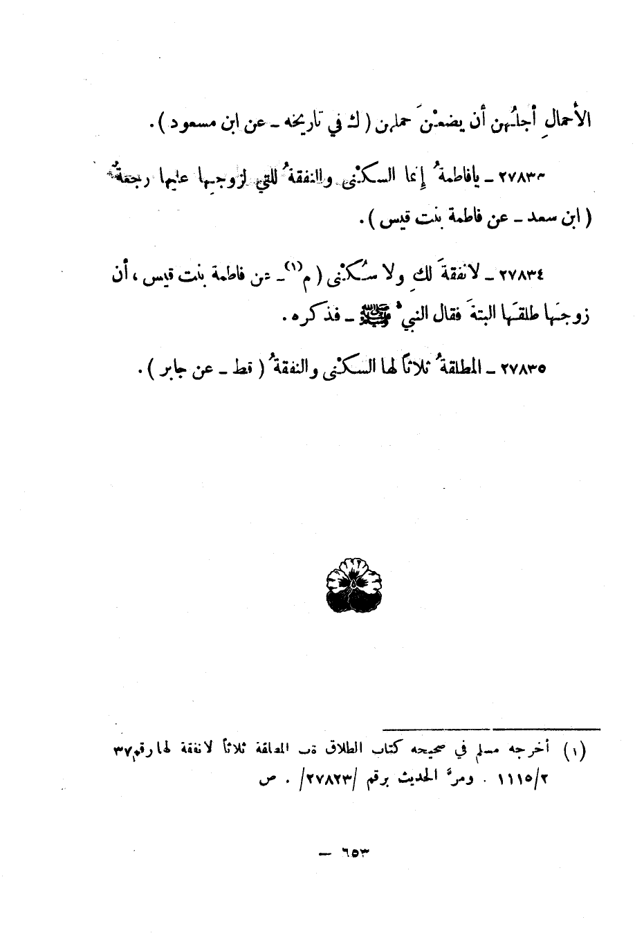 27833- "يا فاطمة إنما السكنى والنفقة للتي لزوجها عليها رجعة". "ابن سعد - عن فاطمة بنت قيس".