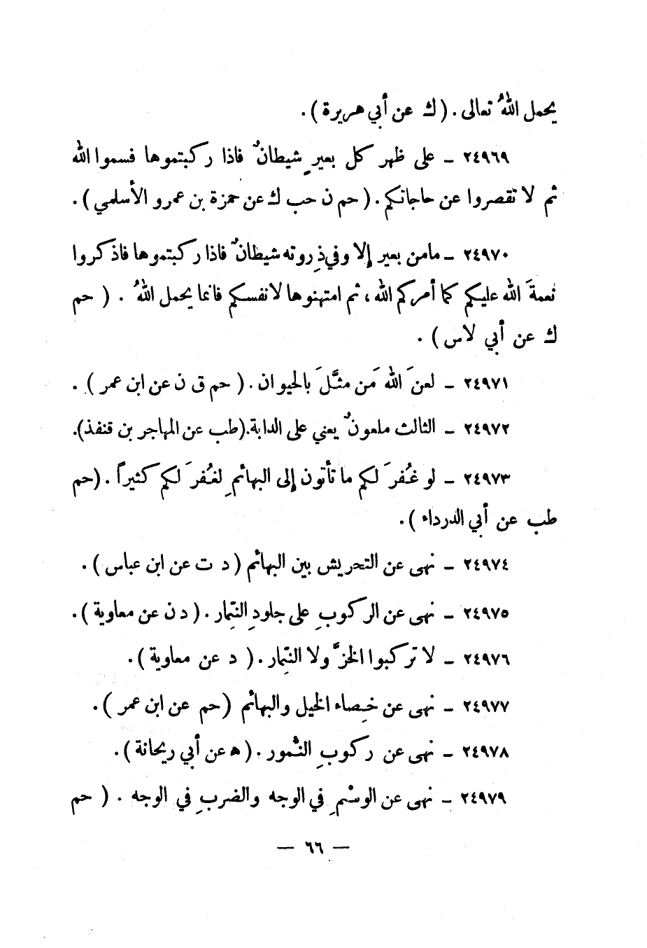 24972- "الثالث ملعون يعني على الدابة". "طب عن المهاجر بن قنفذ".