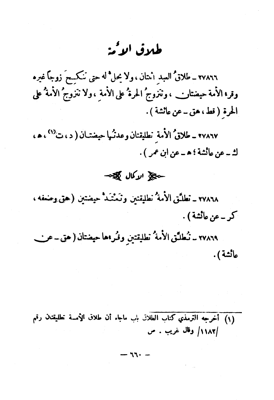 27867- "طلاق الأمة تطليقتان وعدتها حيضتان". "د، ت 1، هـ، ك - عن عائشة؛ هـ - عن ابن عمر".