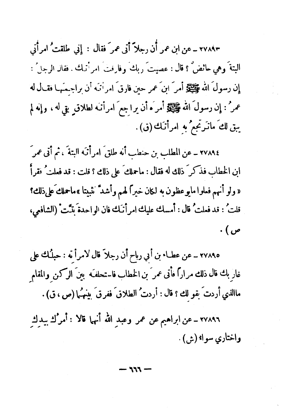 27893- عن ابن عمر "أن رجلا أتى عمر فقال: "إني طلقت امرأتي البتة وهي حائض؟ قال: عصيت ربك وفارقت امرأتك، فقال الرجل: إن رسول الله صلى الله عليه وسلم أمر ابن عمر حين فارق امرأته أن يراجعها فقال له عمر: إن رسول الله صلى الله عليه وسلم أمره أن يراجع امرأته لطلاق بقي له، وإنه لم يبق لك ما ترتجع به امرأتك". "ق".