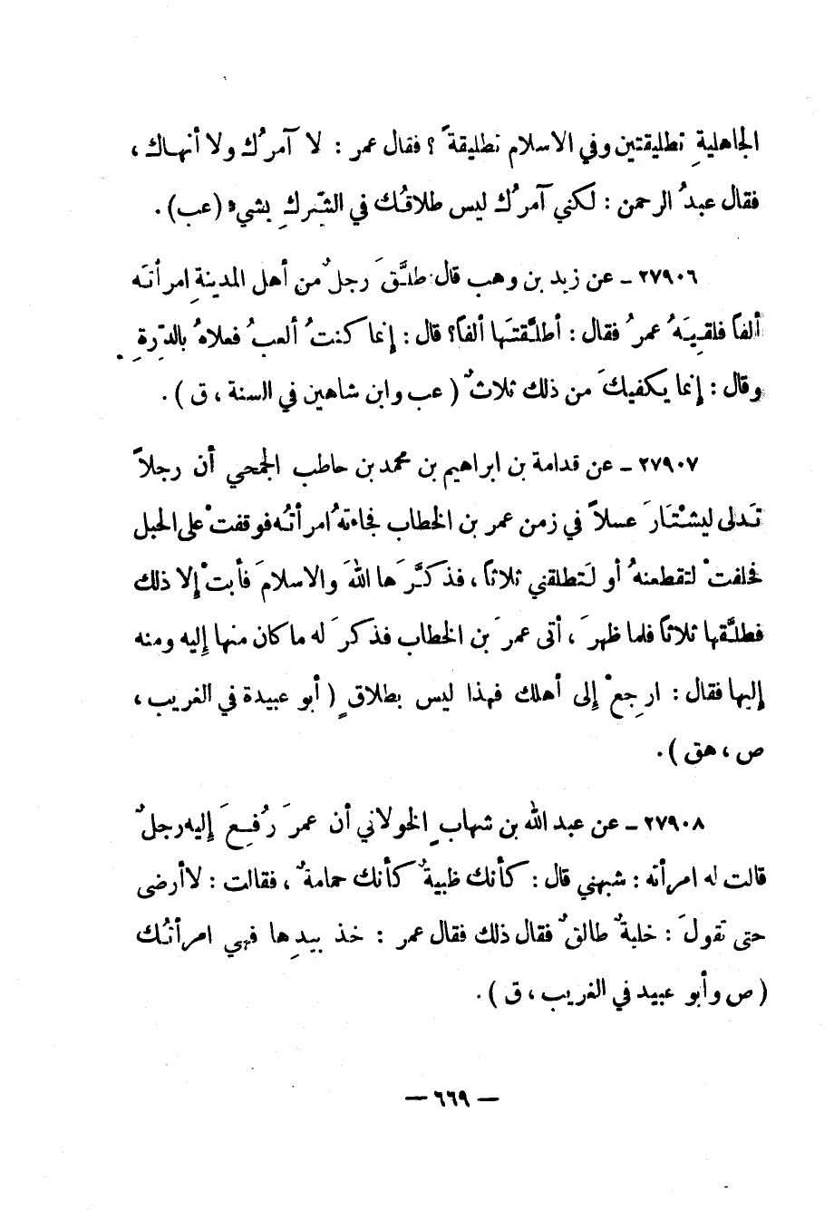 27906- عن زيد بن وهب قال: "طلق رجل من أهل المدينة امرأته ألفا فلقيه عمر فقال: أطلقتها ألفا؟ قال: إنما كنت ألعب فعلاه بالدرة وقال: إنما يكفيك من ذلك ثلاث". "عب وابن شاهين في السنة، ق".