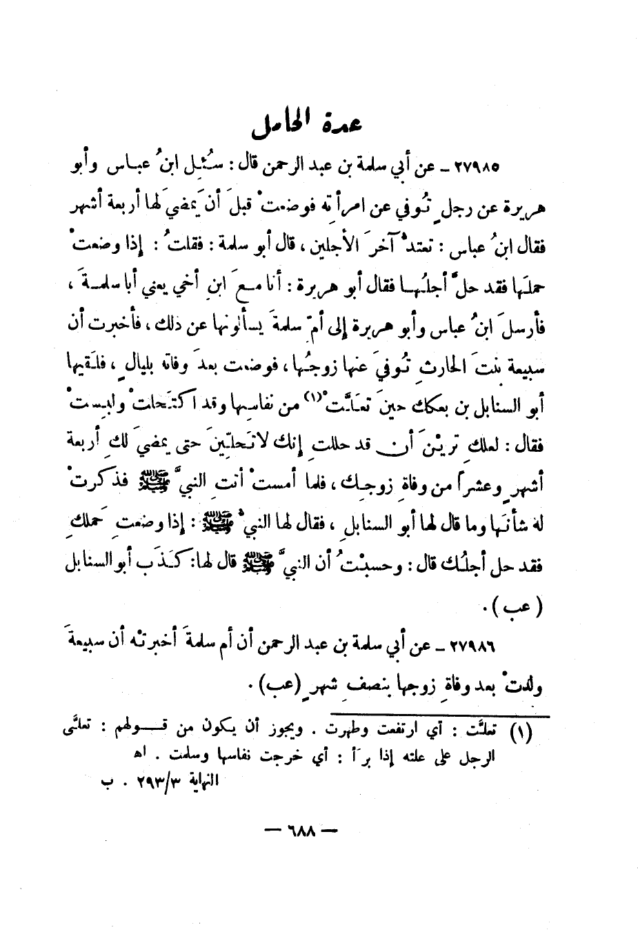 27985- عن أبي سلمة بن عبد الرحمن قال: "سئل ابن عباس وأبو هريرة عن رجل توفي عن امرأته فوضعت قبل أن يمضي لها أربعة أشهر فقال ابن عباس: تعتد آخر الأجلين، قال أبو سلمة: فقلت: إذا وضعت حملها فقد حل أجلها فقال أبو هريرة: أنا مع ابن أخي يعني أبا سلمة، فأرسل ابن عباس وأبو هريرة إلى أم سلمة يسألونها عن ذلك، فأخبرت أن سبيعة بنت الحارث توفي عنها زوجها، فوضعت بعد وفاته بليال، فلقيها أبو السنابل بن بعكك حين تعلت 1 من نفاسها وقد اكتحلت ولبست فقال: لعلك ترين أن قد حللت إنك لا تحلين حتى يمضي لك أربعة أشهر وعشرا من وفاة زوجك، فلما أمست أتت النبي صلى الله عليه وسلم فذكرت له شأنها وما قال لها أبو السنابل، فقال لها النبي صلى الله عليه وسلم: "إذا وضعت حملك فقد حل أجلك" قال: وحسبت أن النبي صلى الله عليه وسلم قال لها: "كذب أبو السنابل". "عب".