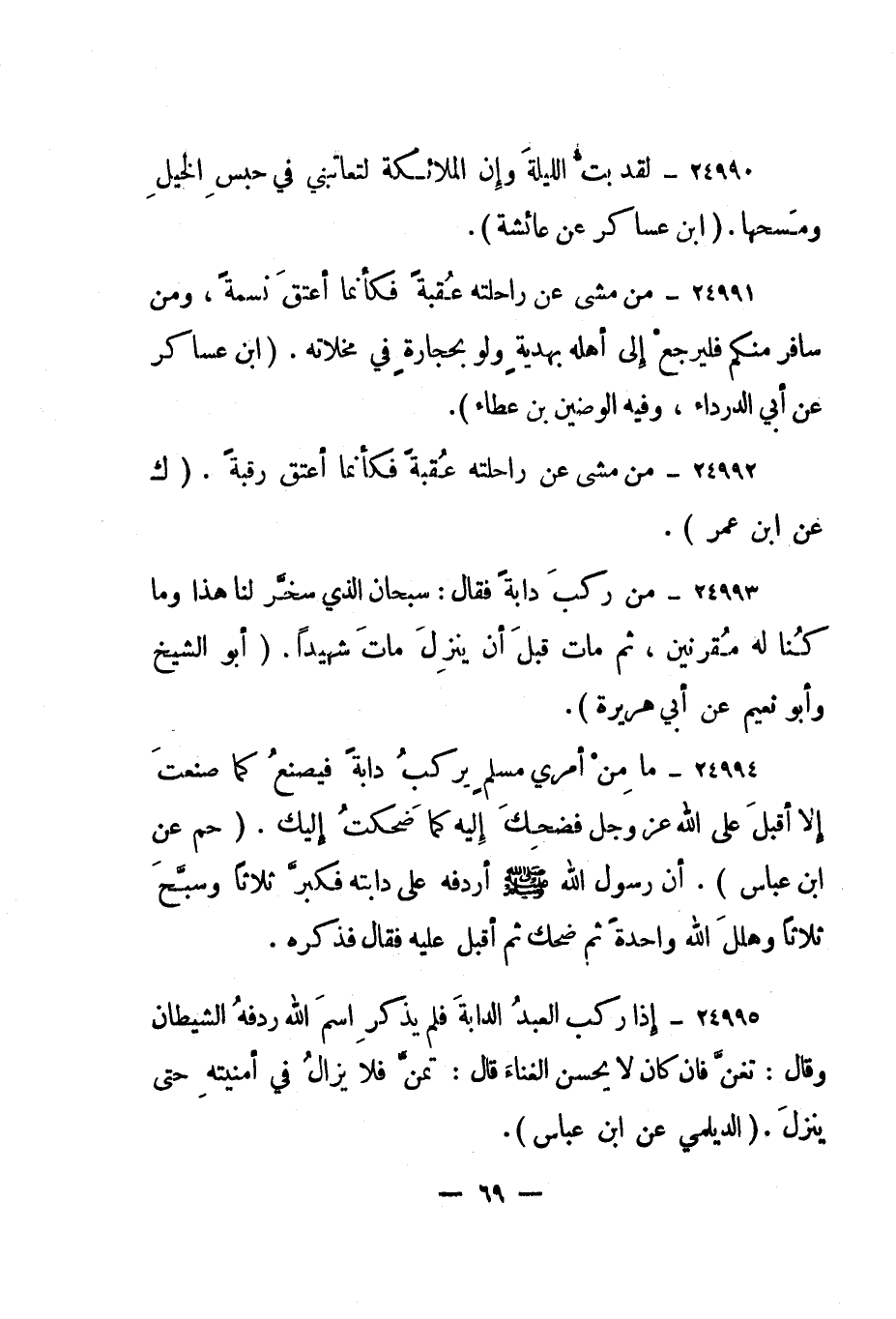 24990- "لقد بت الليلة وإن الملائكة لتعاتبني في حبس الخيل ومسحها". "ابن عساكر عن عائشة".