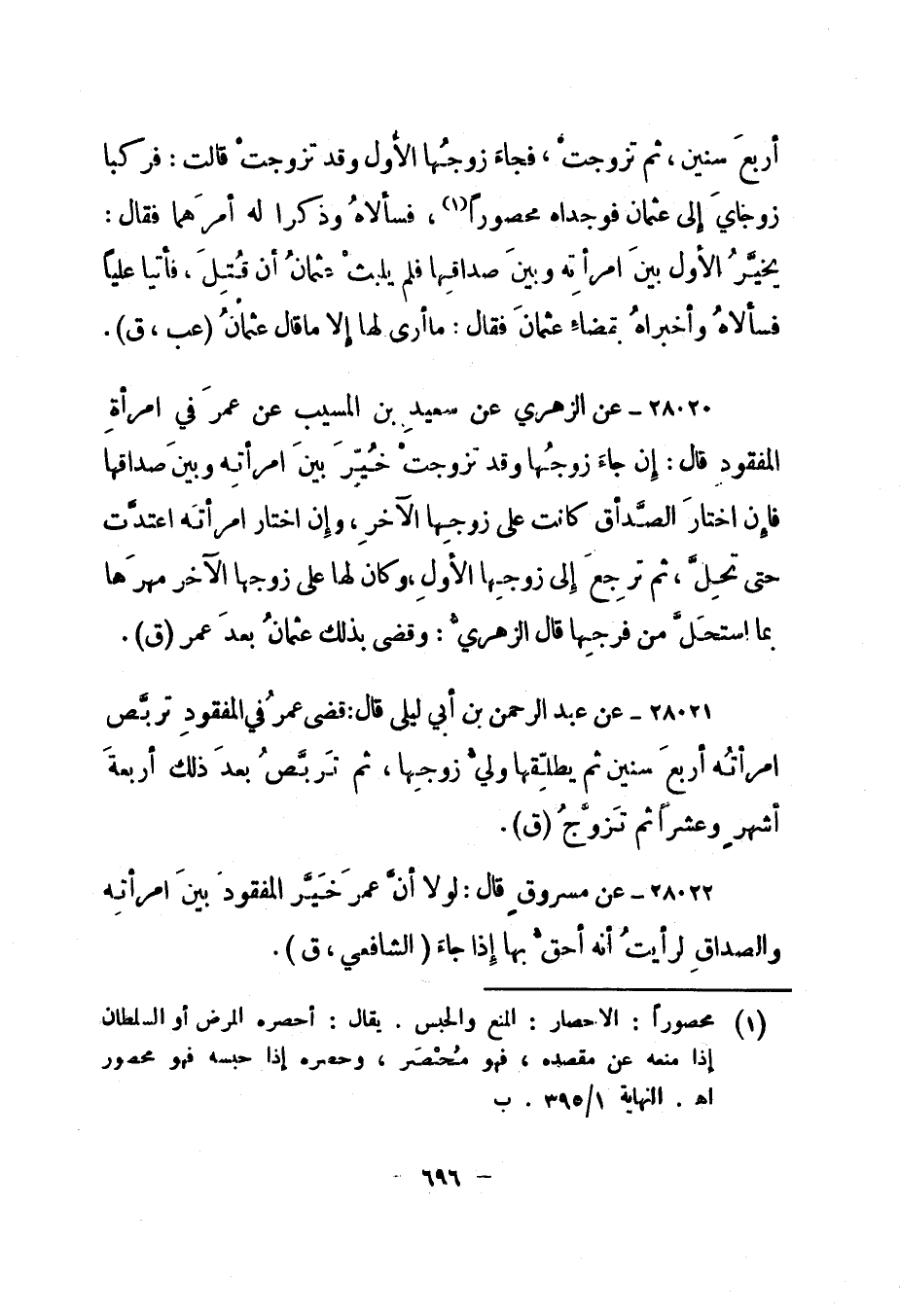 أربع سنين، ثم تزوجت، فجاء زوجها الأول وقد تزوجت قالت: فركبا زوجاي إلى عثمان فوجداه محصورا 1، فسألاه وذكرا له أمرهما فقال: يخير الأول بين امرأته وبين صداقها فلم يلبث عثمان أن قتل، فأتيا عليا فسألاه وأخبراه بقضاء عثمان فقال: ما أرى لها إلا ما قال عثمان". "عب، ق".