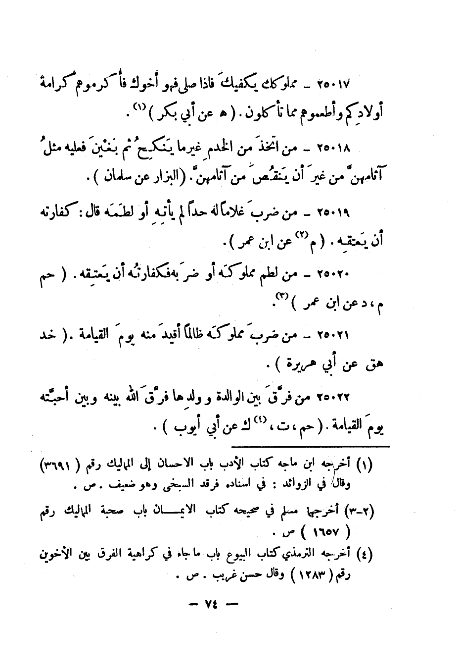 25020- "من لطم مملوكه أو ضربه فكفارته أن يعتقه". "حم م، د عن ابن عمر" 3