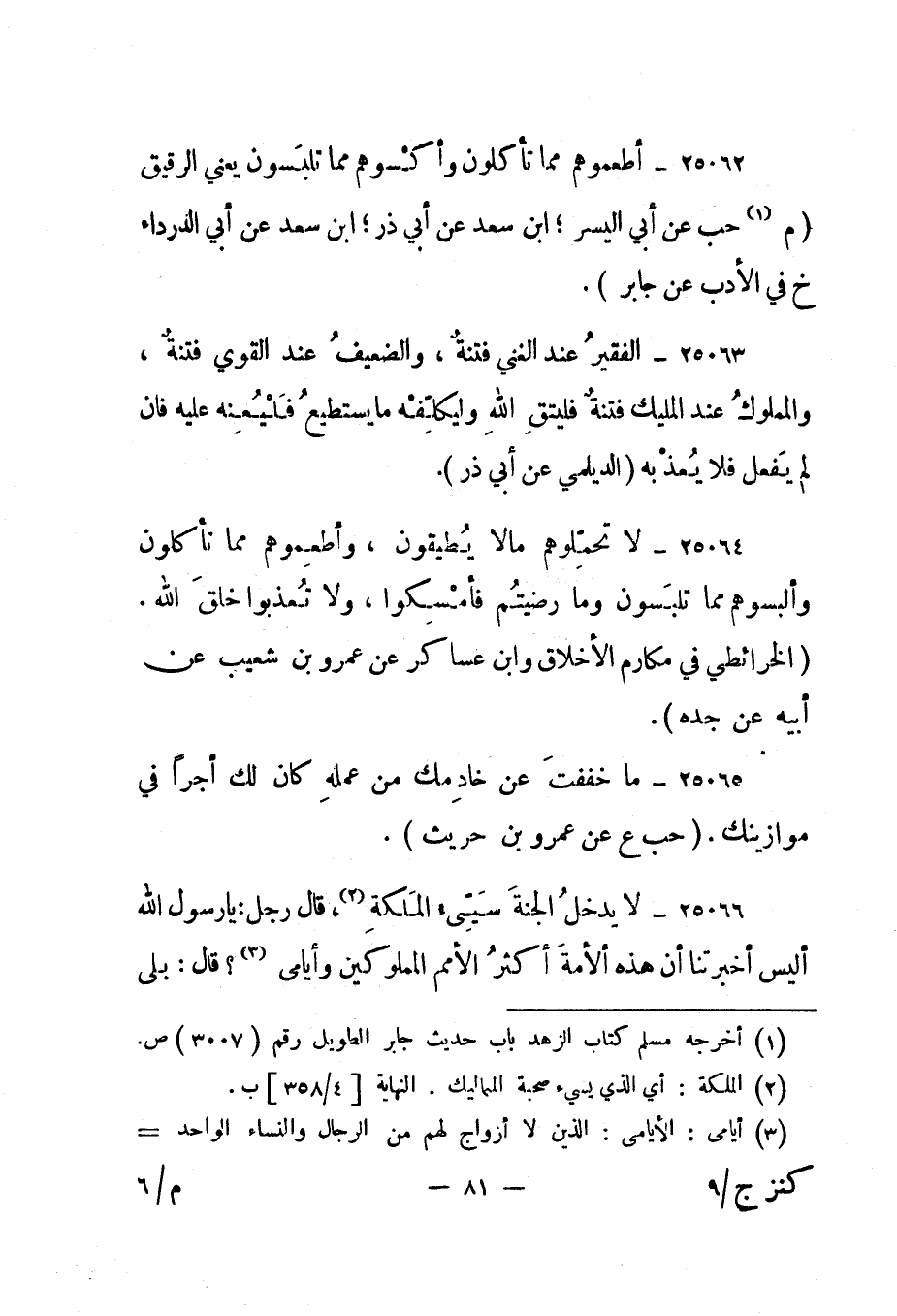 25064- "لا تحملوهم ما لا يطيقون، وأطعموهم مما تأكلون وألبسوهم مما تلبسون وما رضيتم فأمسكوا، ولا تعذبوا خلق الله". "الخرائطي في مكارم الأخلاق وابن عساكر عن عمرو بن شعيب عن أبيه عن جده".