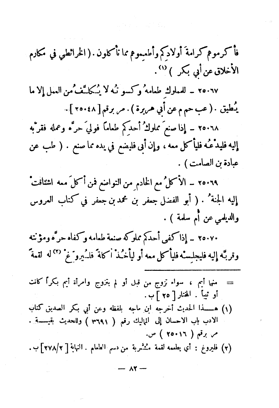 25069- "الأكل مع الخادم من التواضع فمن أكل معه اشتاقت إليه الجنة". "أبو الفضل جعفر بن محمد بن جعفر في كتاب العروس والديلمي عن أم سلمة".