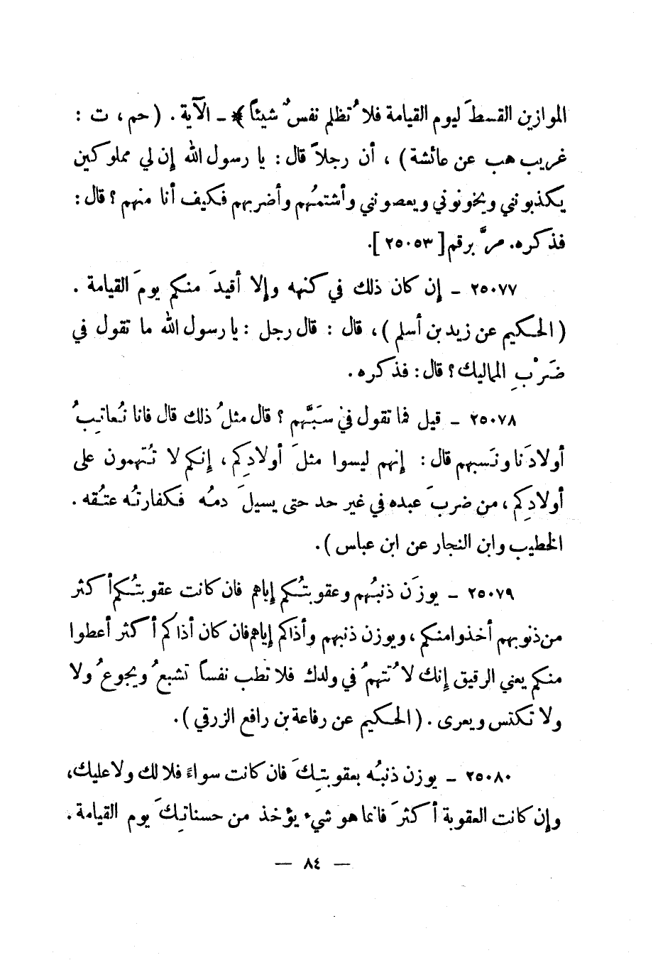 25079- "يوزن ذنبهم وعقوبتكم إياهم فإن كانت عقوبتكم أكثر من ذنوبهم أخذوا منكم، ويوزن ذنبهم وأذاكم إياهم فإن كان أذاكم أكثر أعطوا منكم يعني الرقيق إنك لا تتهم في ولدك فلا تطب نفسا تشبع ويجوع ولا تكتس ويعرى". "الحكيم عن رفاعة بن رافع الزرقي".