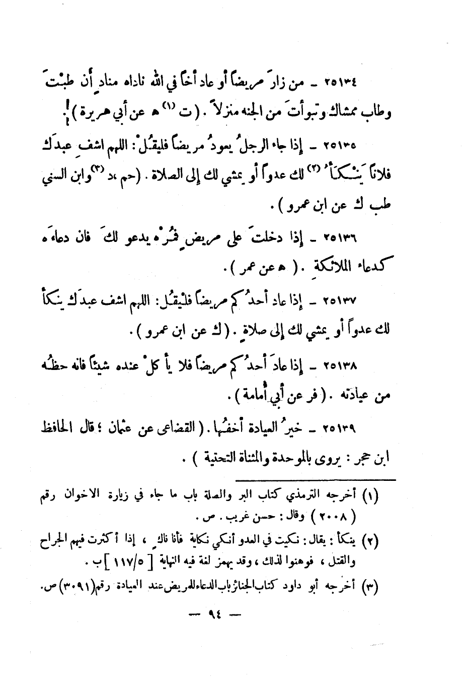 25136- "إذا دخلت على مريض فمره يدعو لك فإن دعاءه كدعاء الملائكة". "هـ عن عمر".
