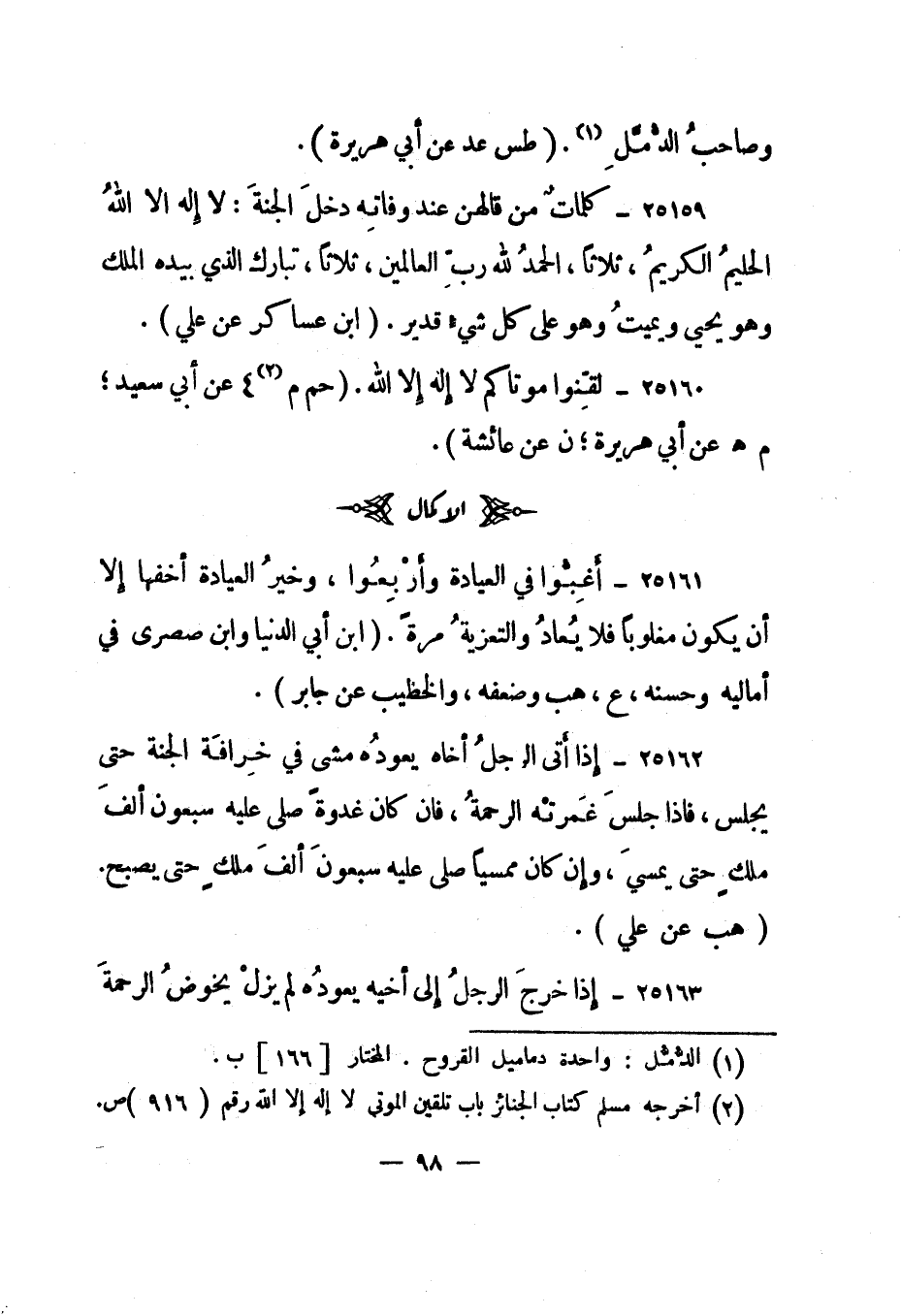 25160- "لقنوا موتاكم لا إله إلا الله". "حم م"2" 4 عن أبي سعيد؛ انتهى. عن أبي هريرة؛ ن عن عائشة".